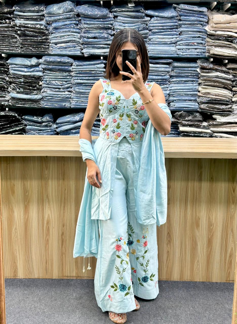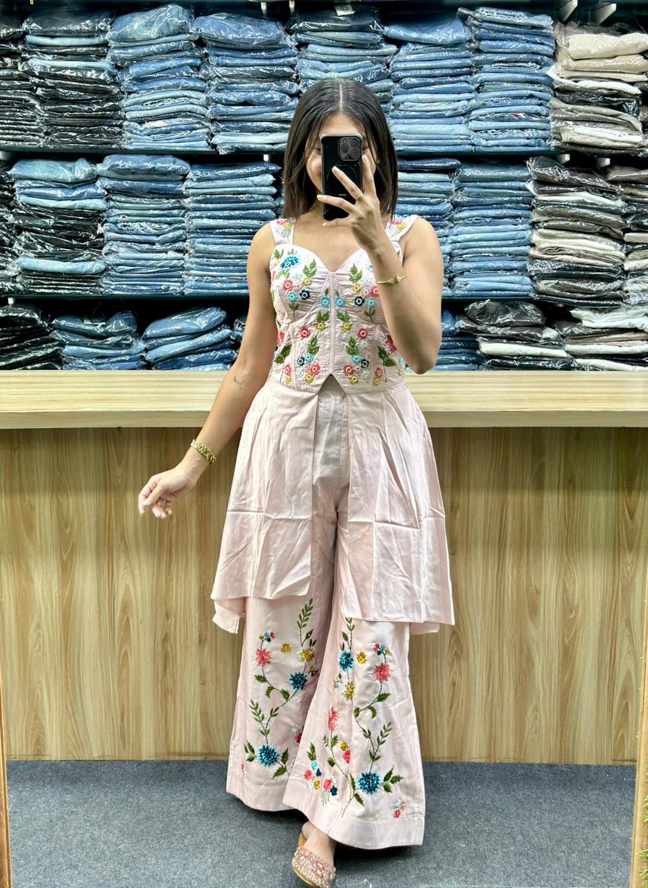 Bottom: It is paired with matching wide-legged pants or palazzo trousers that have a partially elasticated waistband for comfort. These also feature matching floral embroidery accents near the hems.