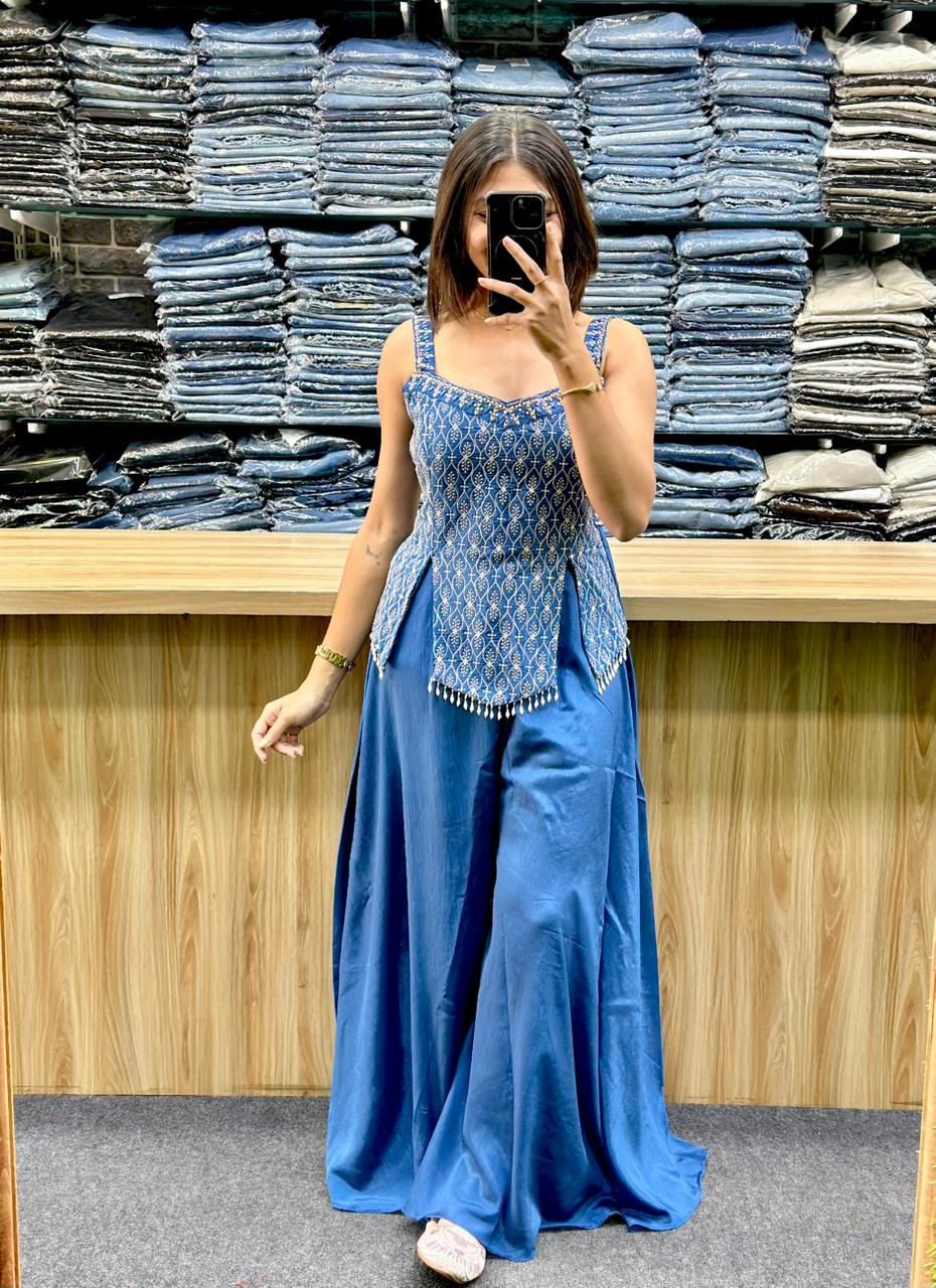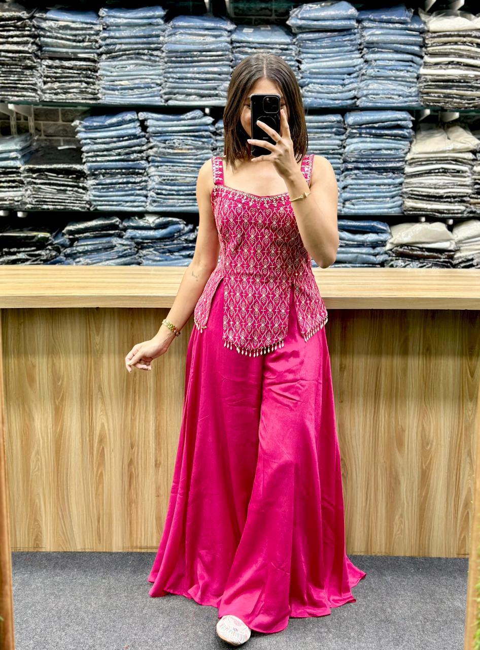 STYLE : SLEEVELESS PEPLOM STYLE TOP WITH EMBORIDERY AND HAND WORK ,MATCHING PLAIN PLAZA AND DUPATTA