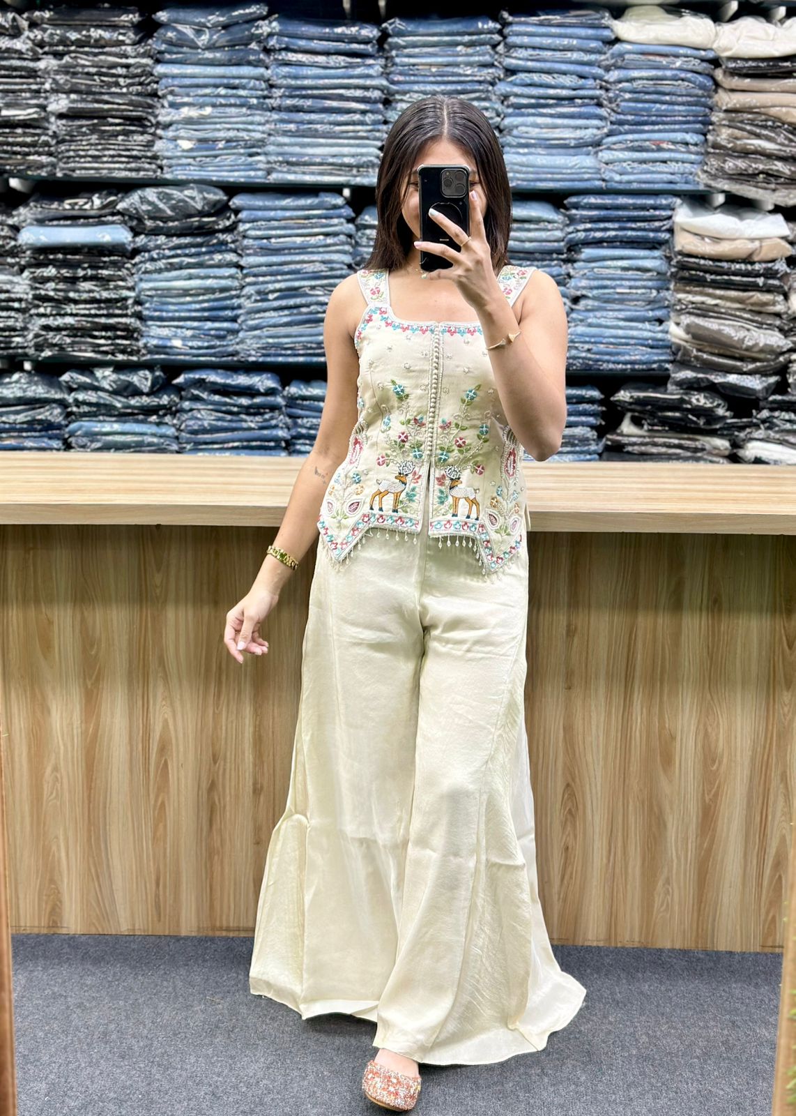 - Bottoms: Matching wide-legged, flared palazzo made from the same tissue shimmer fabric.