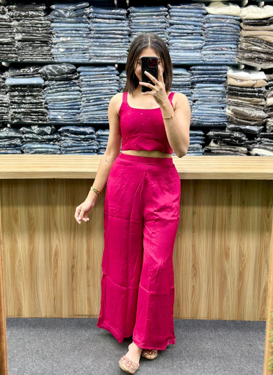 - Coordinated Bottoms: The set is completed with high-waisted, flared palazzo pants, which provide a flowing, modern silhouette.