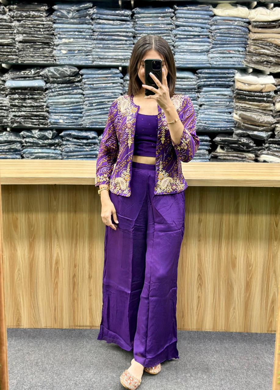 - Color & Fabric: The ensemble is a vibrant purple and pink. Similar styles are often crafted from Chinon silk or tissue shimmer fabrics, giving them a subtle, festive sheen.
