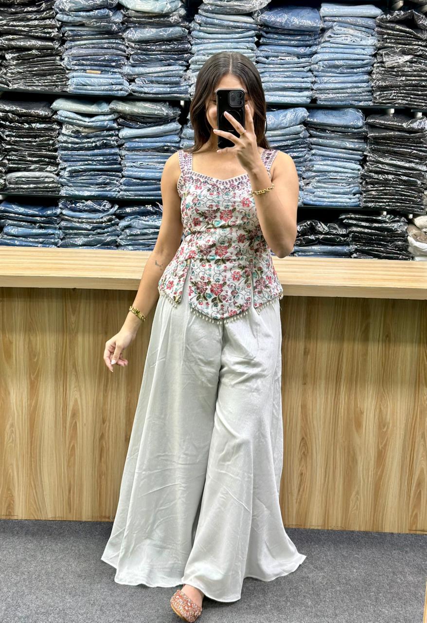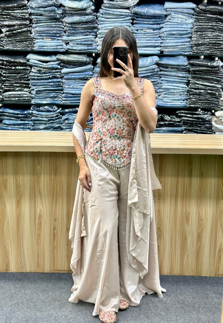 STYLE : SHORT SPAGHETTI STYLE TOP WITH EMBROIDERY AND HAND WORK ,PLAIN FLARED PLAZA AND DUPATTA