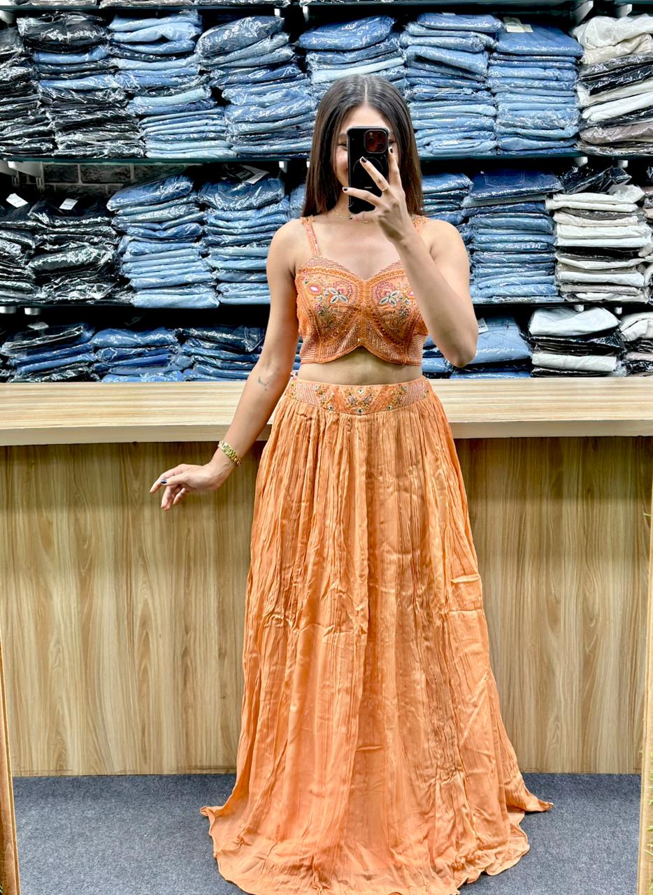 - Color and Fabric: The outfit is a vibrant peach-orange color and appears to be made from a lightweight, flowy fabric such as organza or georgette, which contributes to the skirt's full flair.