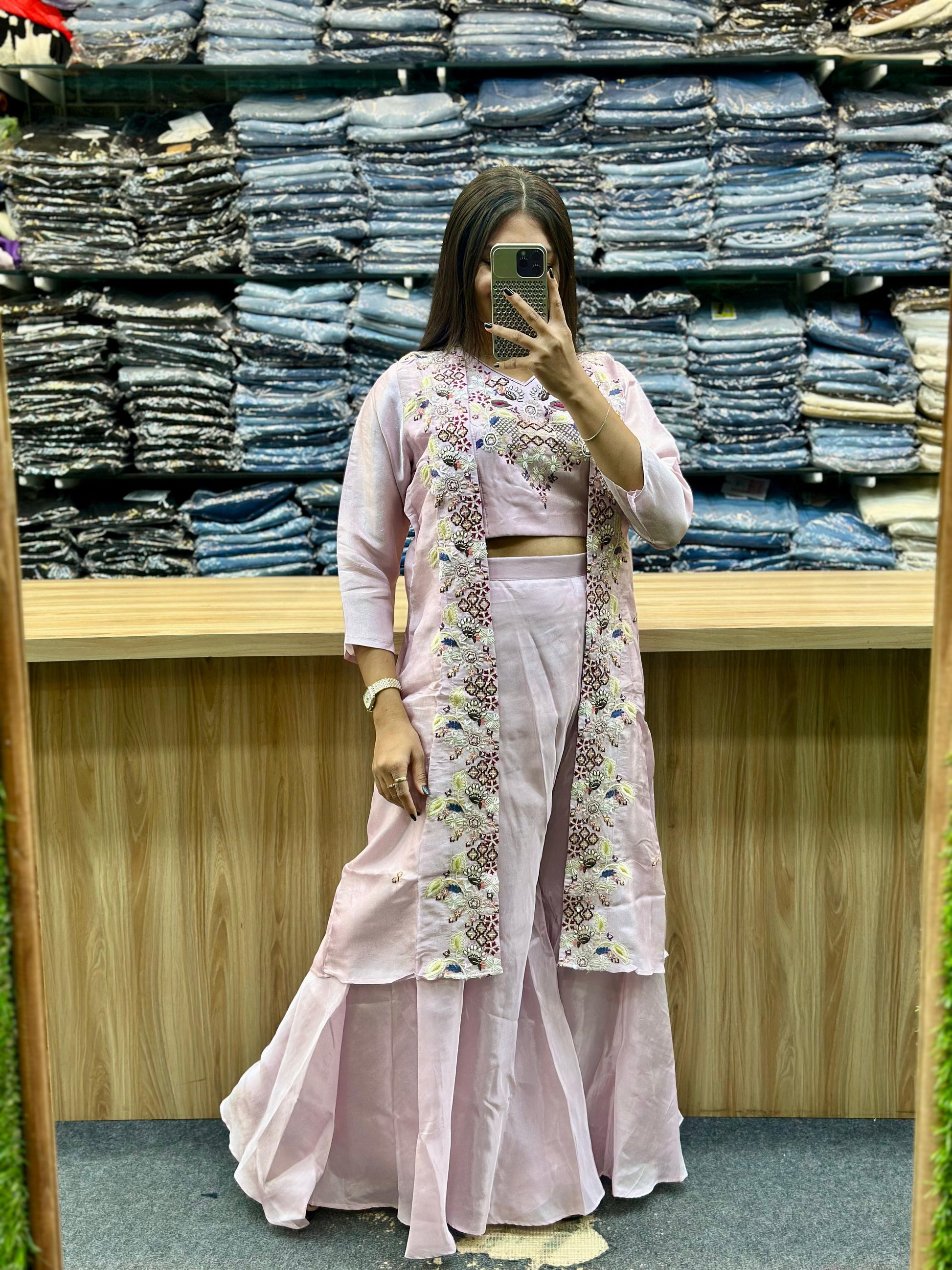 STYLE : CROP WORKED INNER , FLARED PLAZA AND WORKED LONG SHRUG