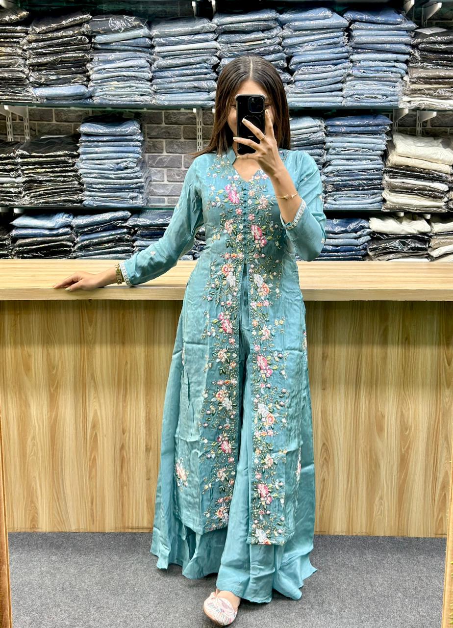 STYLE : LONG KURTI WITH CENTER CUT,FULL OF EMBROIDERY AND HAND WORK, CHINESE COLLAR IT HAS,PLAIN FLARED PLAZA AND DUPATTA