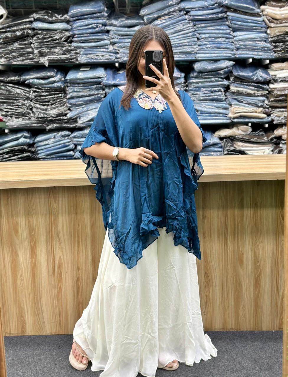 - Top: The top is a flowy, blue poncho-style garment with a v-neckline and embroidered floral detailing around the collar. It has a loose, asymmetrical hem and sheer, ruffled fabric along the edges. The material appears to be a lightweight, silky fabric.