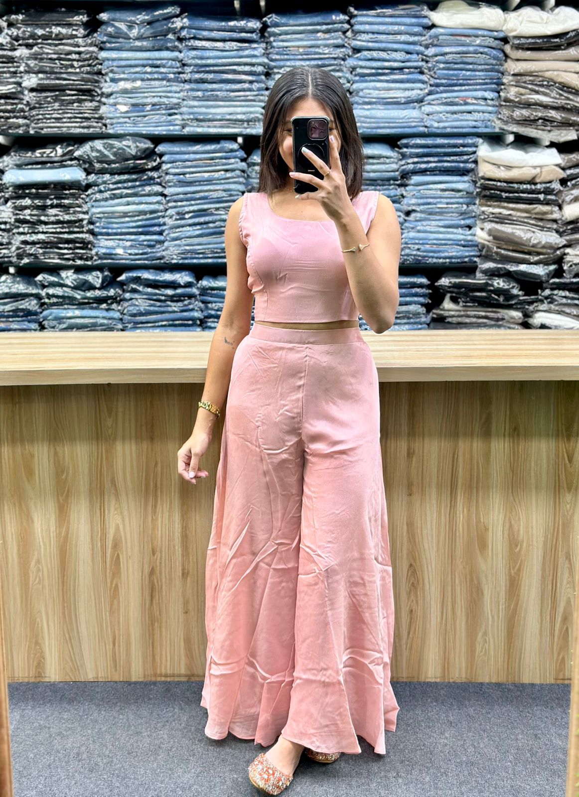 STYLE : PLAIN CROP INNER AND FLARED PLAZA ,SHRUG WITH EMBROIDERY AND HAND WORK ON IT