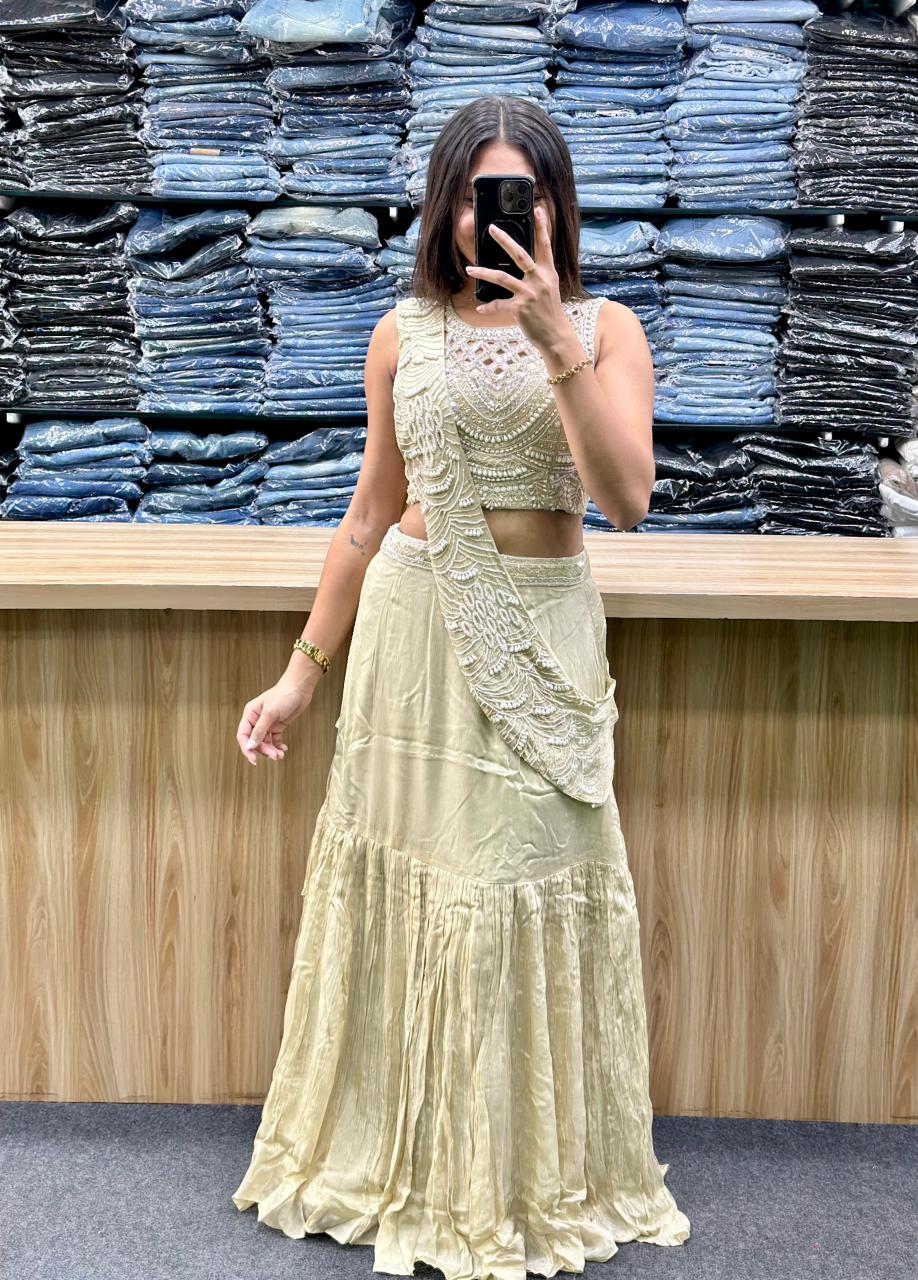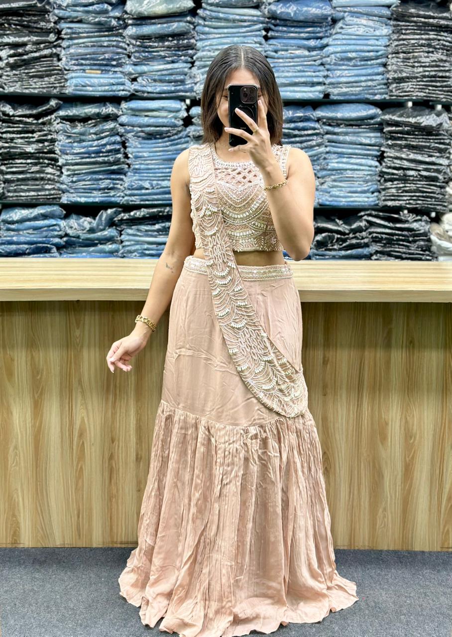 STYLE : CROP BLOUSE WITH EMBROIDERY AND HAND WORK ON IT,FISH CUT STYLE LEHENGA AND ATTACHED WORKED DUPATTA
