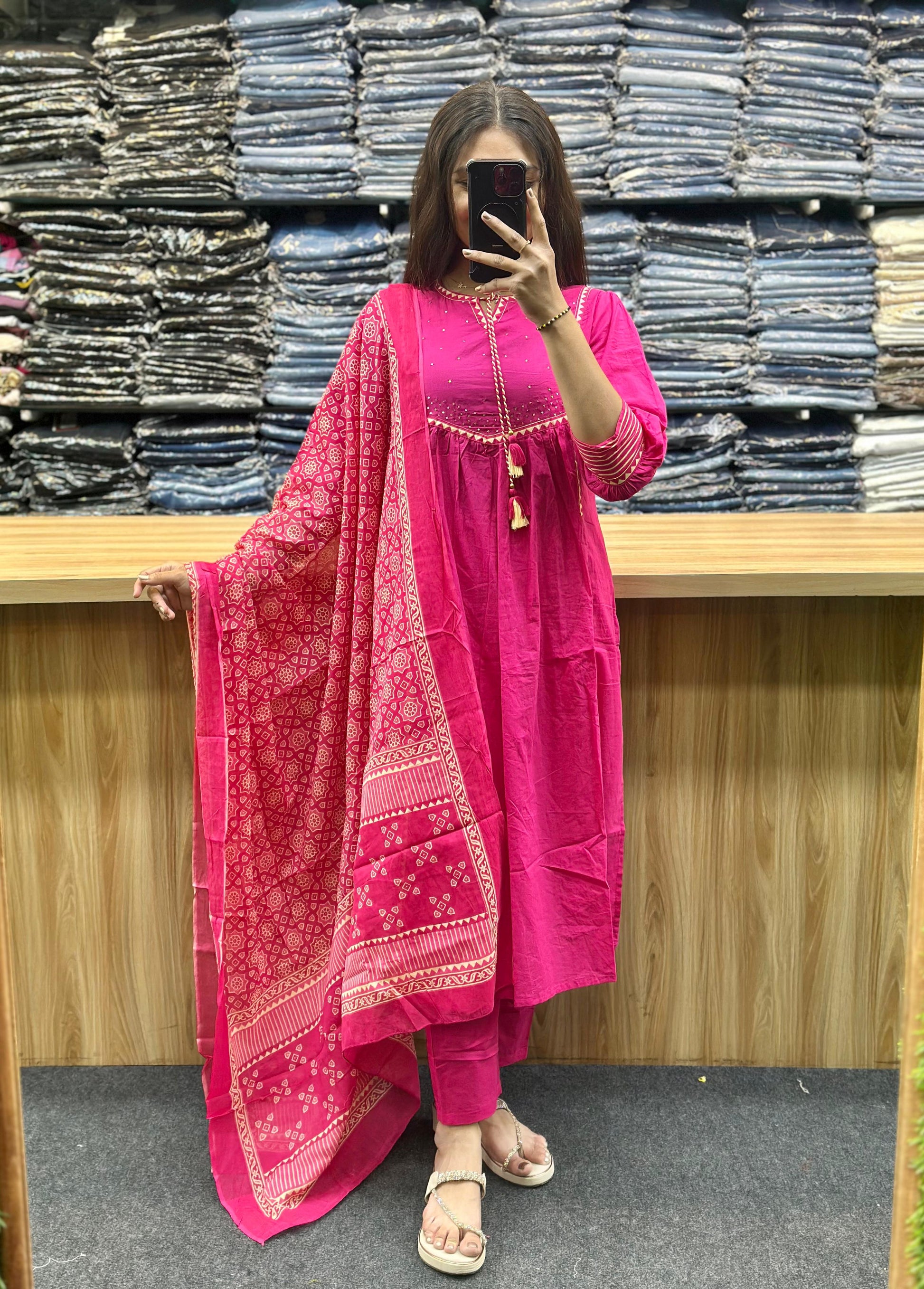 - Anarkali Kurta (Top): The prominent feature is the long, frock-style kurti in a rich purple or deep mauve color, fitted at the bodice and flaring out dramatically from the waist, creating a graceful, voluminous look. The neckline appears to be a round or keyhole style with delicate embellishments around it and a central tassel detail. The sleeves are three-quarter length, adorned with a subtle design near the cuffs.