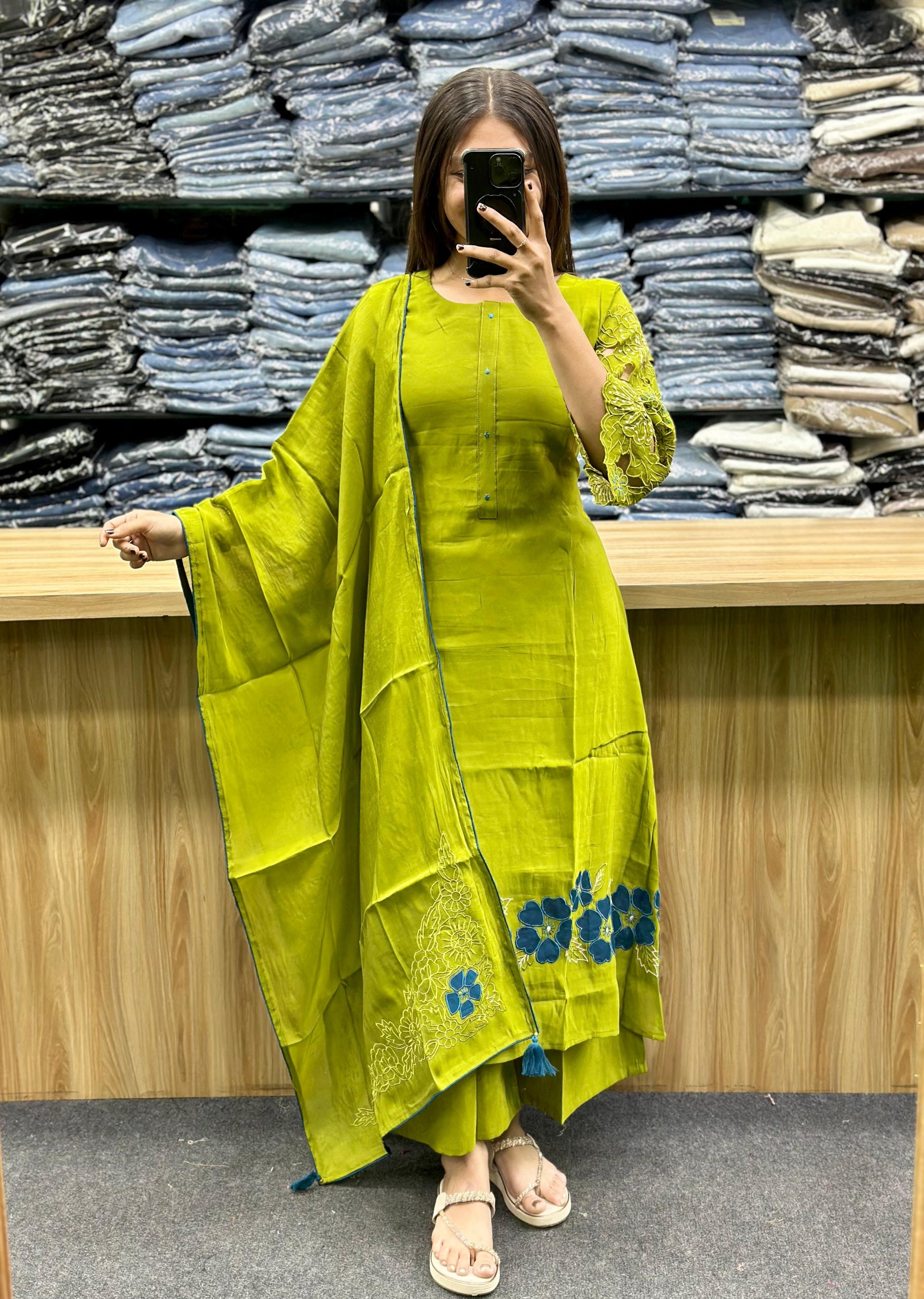 - Bottom & Dupatta: The kurta is worn over what appear to be straight-cut pants in the same lime green color. A light, matching dupatta with blue piping or a subtle border is draped over one shoulder and arm.