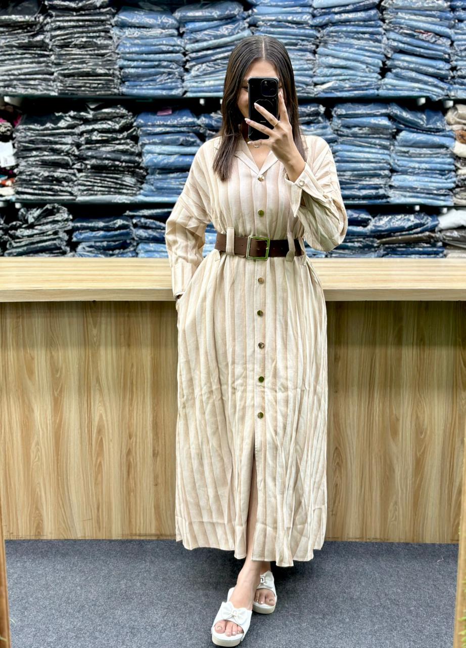 - Color & Pattern: The dress is in a light, neutral tone, likely beige or off-white, featuring delicate vertical stripes throughout the fabric.