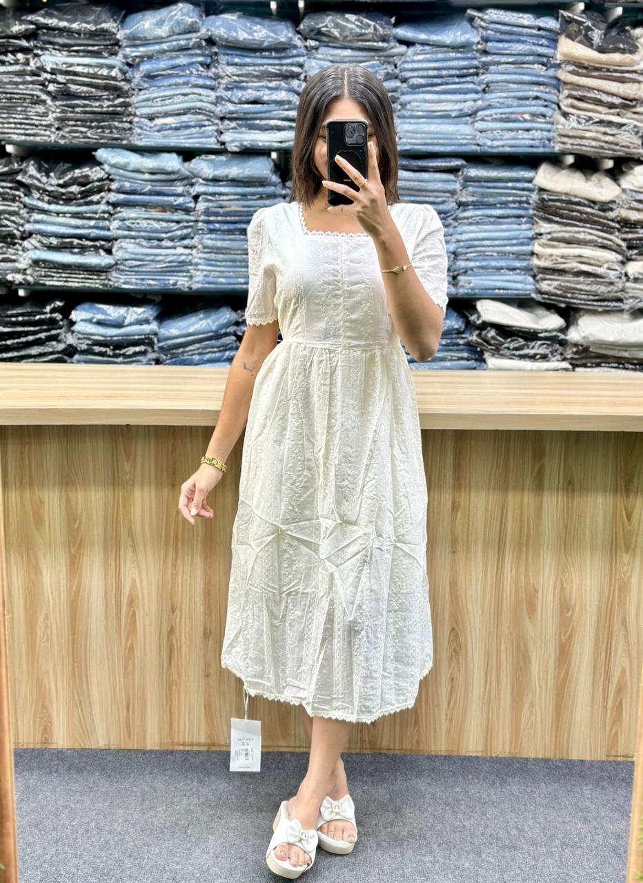The outfit is a midi dress featuring short puff sleeves and a square neckline. It has a fit-and-flare silhouette with a tiered, A-line skirt that falls to a midi or calf length. The dress is made from a fabric, likely cotton, with a textured or embroidered pattern, often referred to as Hakoba or Schiffli work.