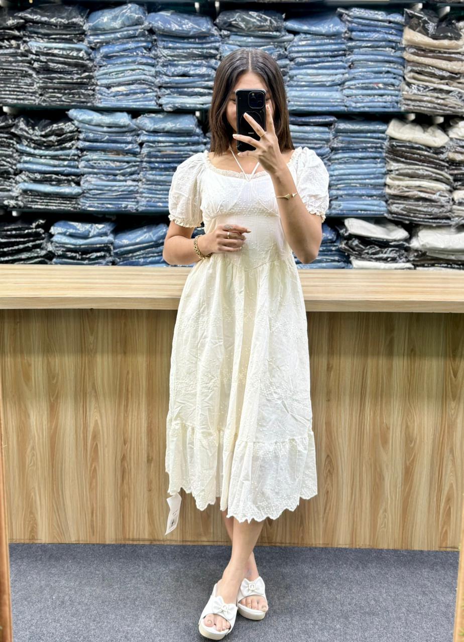 The outfit is a white midi dress featuring short puff sleeves and a square neckline. It has a fit-and-flare silhouette with a tiered, A-line skirt that falls to a midi or calf length. The dress is made from a fabric, likely cotton, with a textured or embroidered pattern, often referred to as Hakoba or Schiffli work.