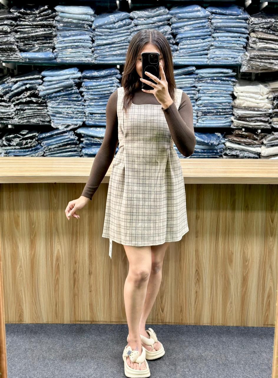 The outfit consists of a sleeveless overall or pinafore dress in a light brown or beige and off-white plaid/check pattern, layered over a fitted, long-sleeve brown top. The dress has a square neckline, thick shoulder straps, and an A-line or fit-and-flare silhouette that ends above the knee.