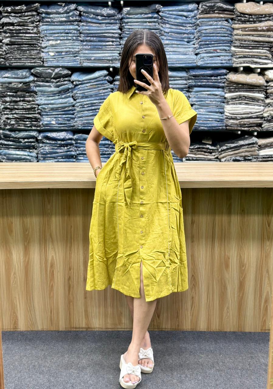 - Design: A midi-length dress with a full-length button-down front and a classic spread collar.