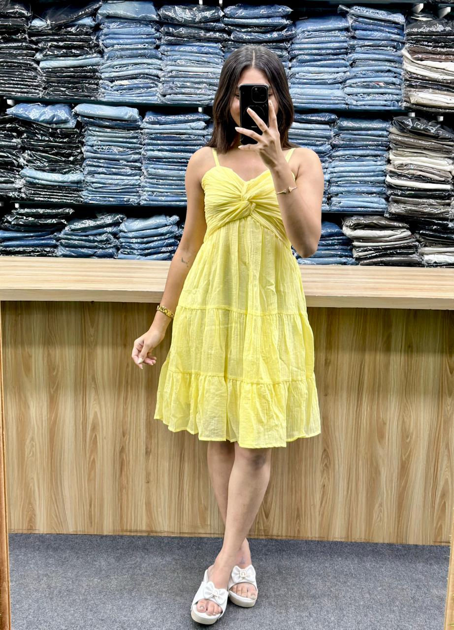 - Midi Dress: The woman is wearing a light, buttery yellow and blue mini-length dress. The dress has spaghetti straps, a V-neckline with a tie-front or knot detail on the bodice, and a tiered A-line or fit-and-flare silhouette that ends above the knees. It appears to be made of a light, textured fabric, suitable for warm weather or a casual day out.