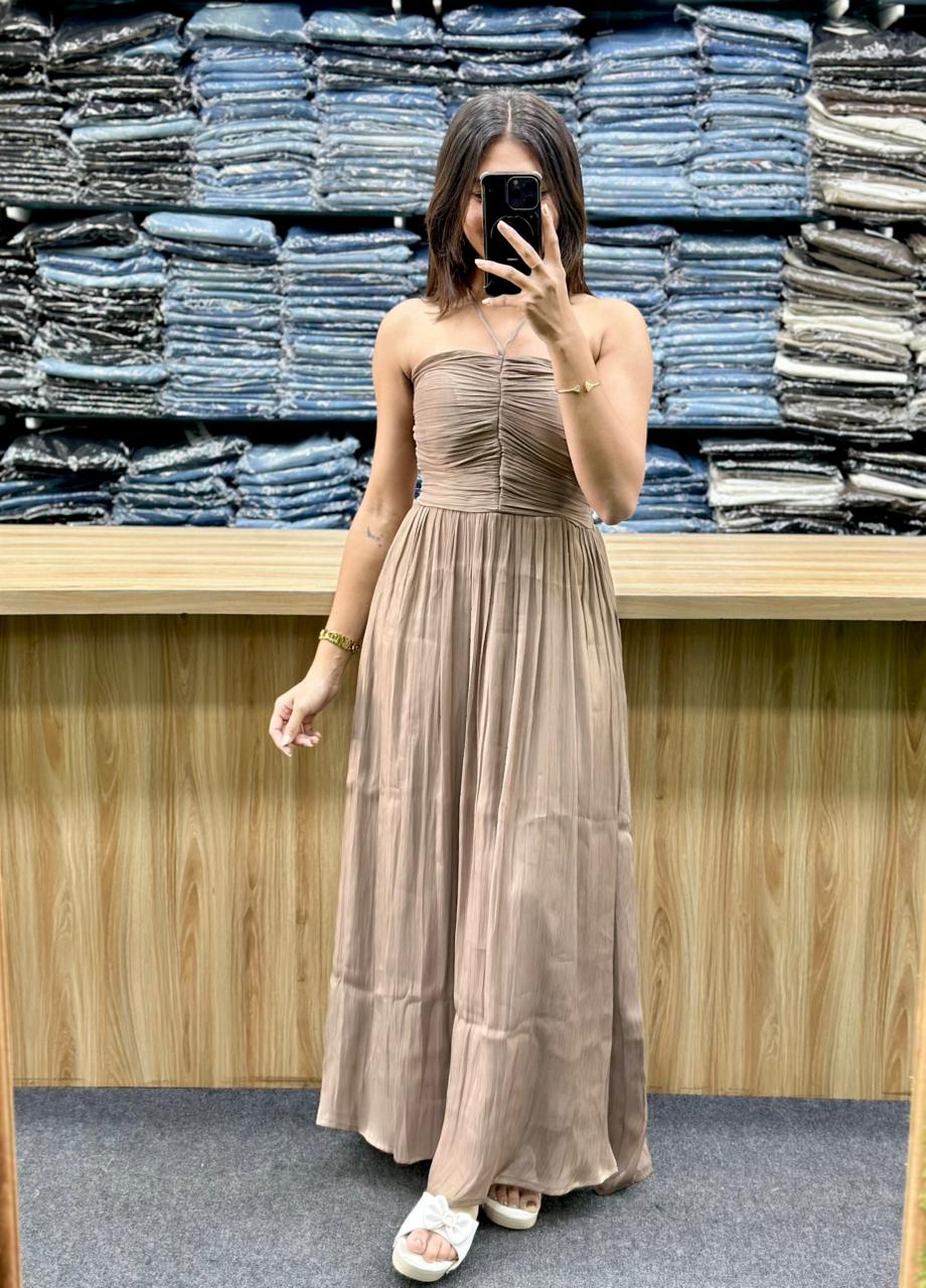 - Style and Fit: The dress features a strapless neckline and a ruched or gathered bodice that provides a fitted look. midi is an A-line or flowy silhouette that drapes elegantly to a maxi or full length. party and wedding function wear style look.