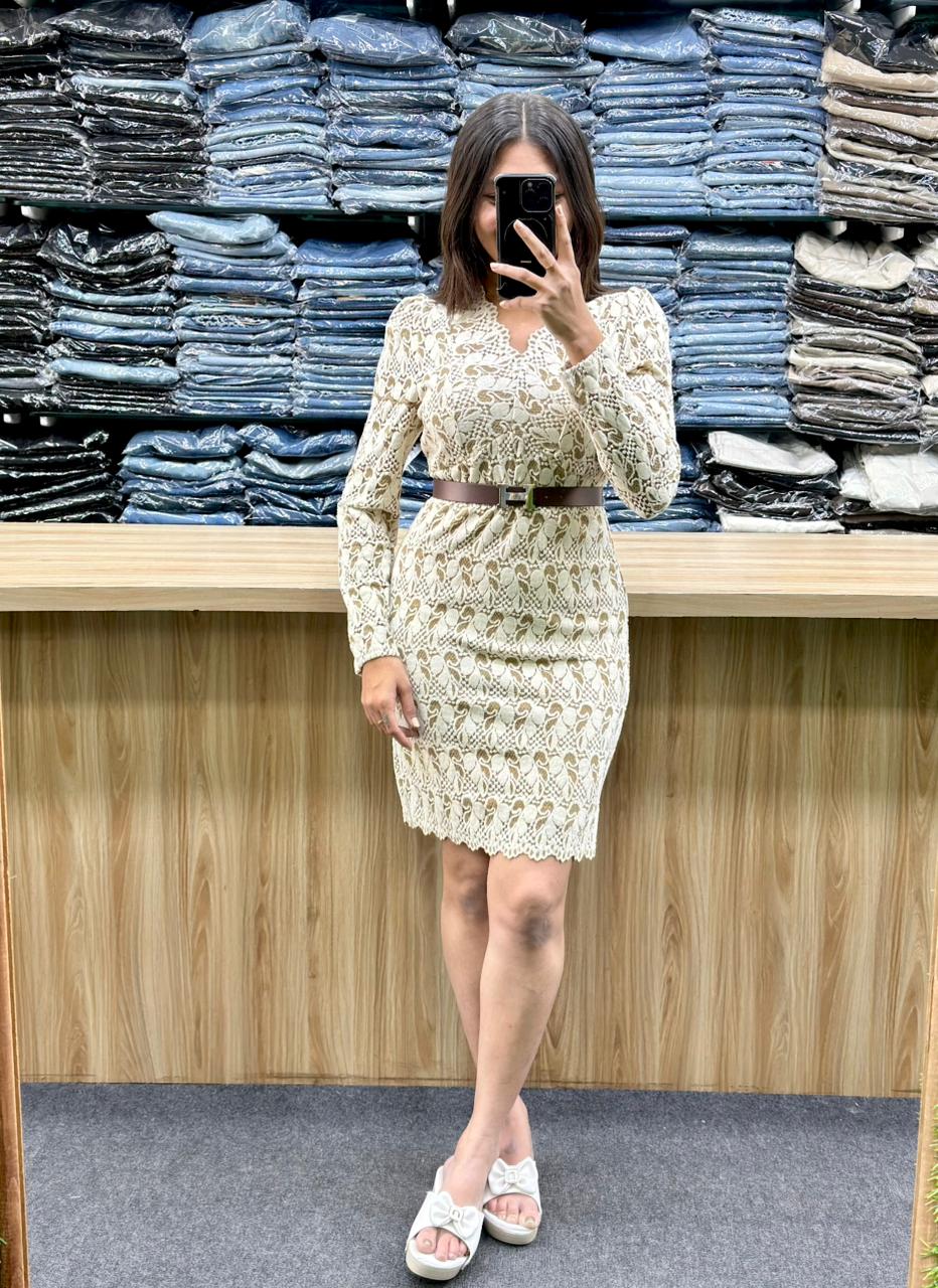 The outfit consists of a beige (or cream/ivory) lace bodycon dress with long puff sleeves, a V-neckline, and a scalloped hem. It is paired with a slim, dark brown belt at the waist, white slip-on sandals with a bow detail, and a smartphone held for a mirror selfie. The dress features an intricate floral or ethnic motifs lace pattern and a fitted silhouette that falls to about knee length.