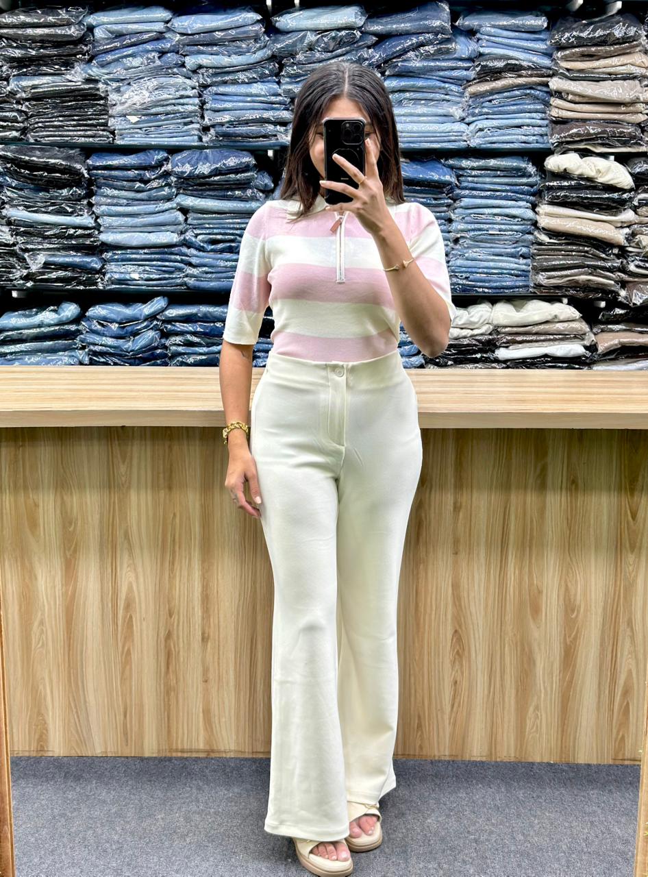 This half-sleeve top features classic horizontal black and off-white stripes. The design includes a shirt-style collar and a short zipper or button-front closure for a polished, athletic look.