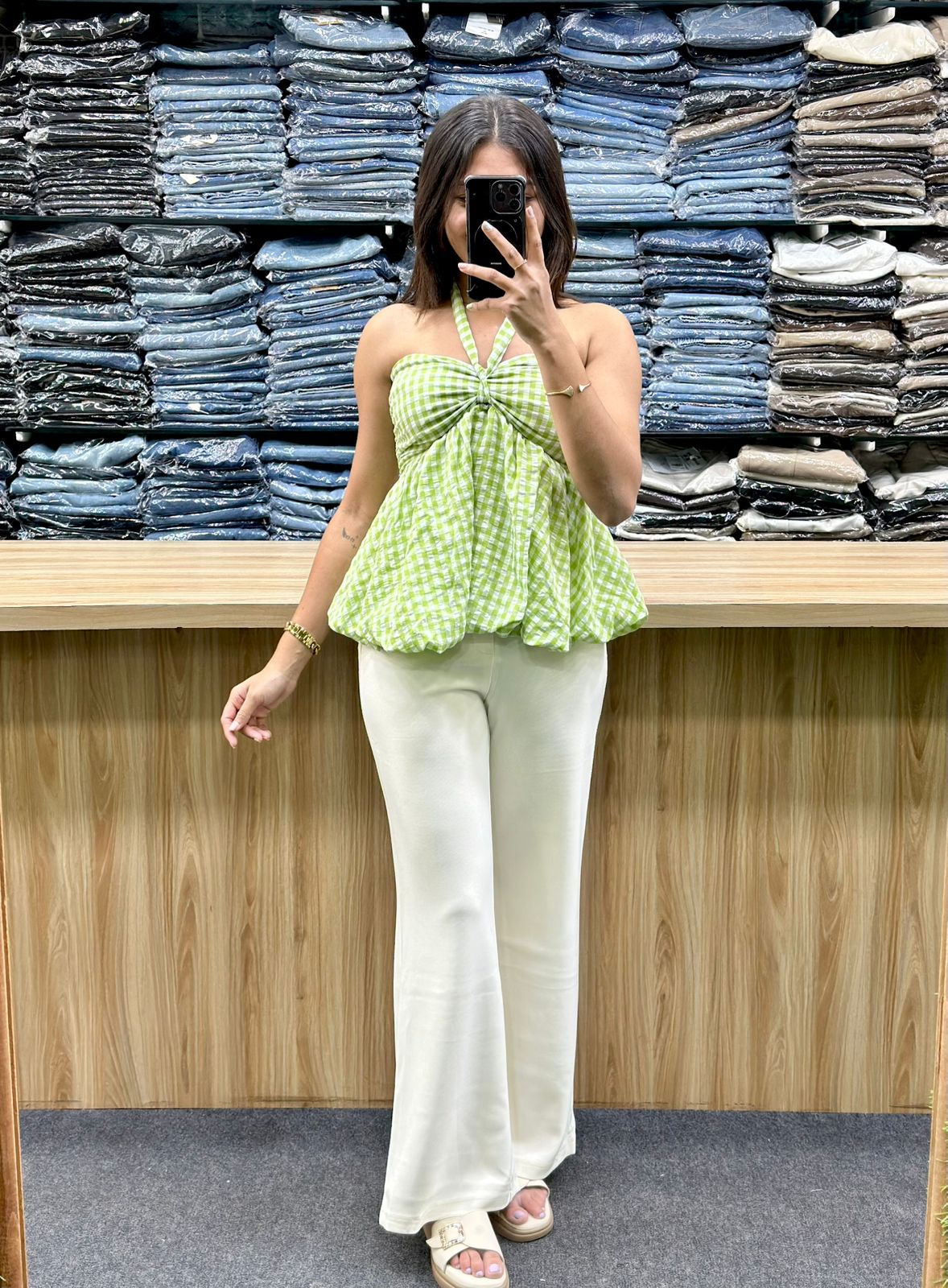 The Pants: The pants are a solid white color, fitted through the thigh and flaring out at the knee into a wide-leg or flared silhouette. They appear to be full-length.
