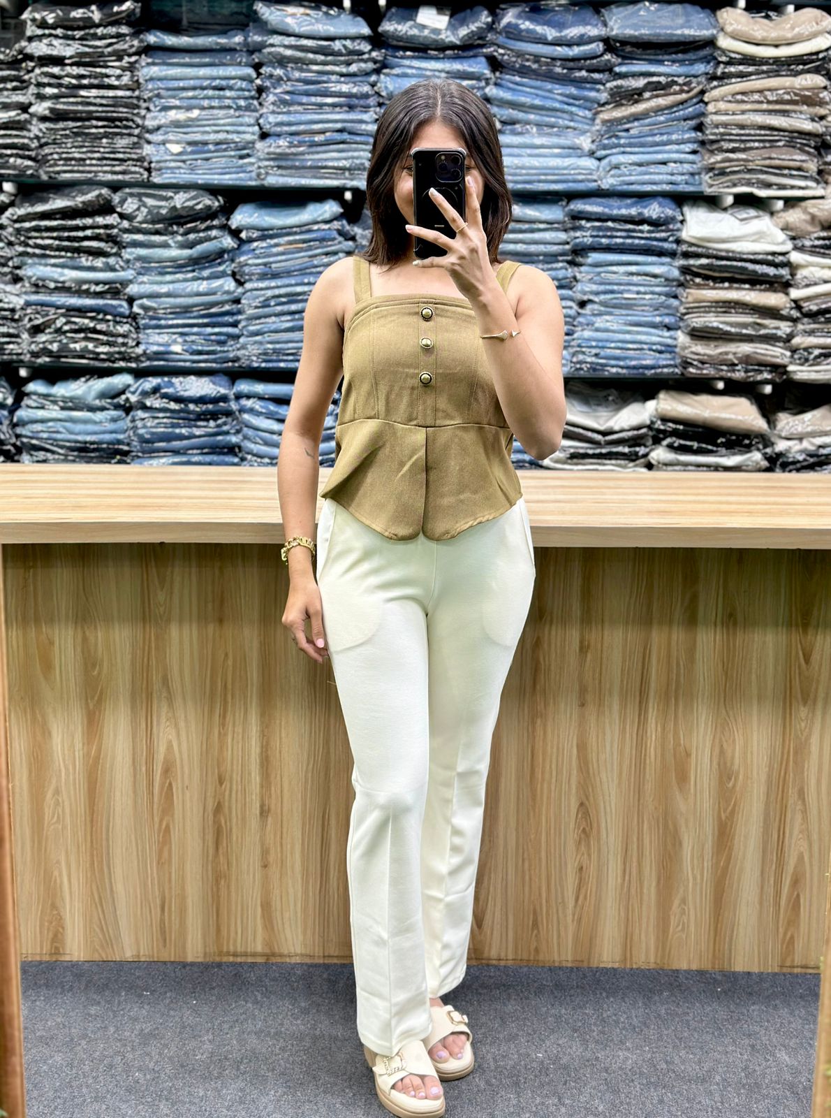 pants long and fitted through the thigh, with a gentle flare at the bottom.