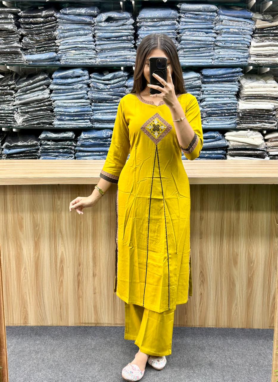 STYLE : LONG SLITTED KURTI WITH EMBROIDERY AND THREAD WORK PATCH ON KURTI AND NECK LINE AND MATCHING PLAIN PLAZA