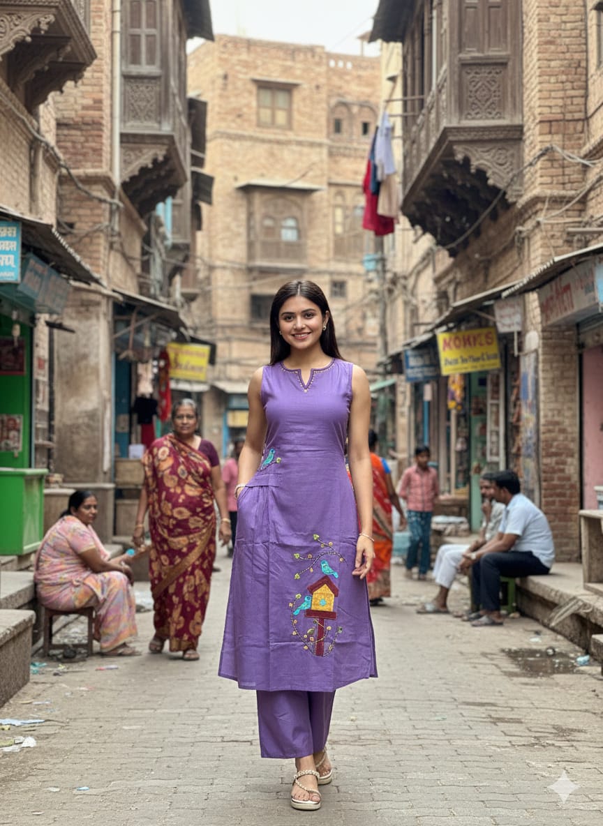 STYLE : A LINE COTTON KURTI WITH PACK NECK AND EMBROIDERY WORK AT BOTTOM OF KURTI,MATCHING PLAIN PLAZA PANT