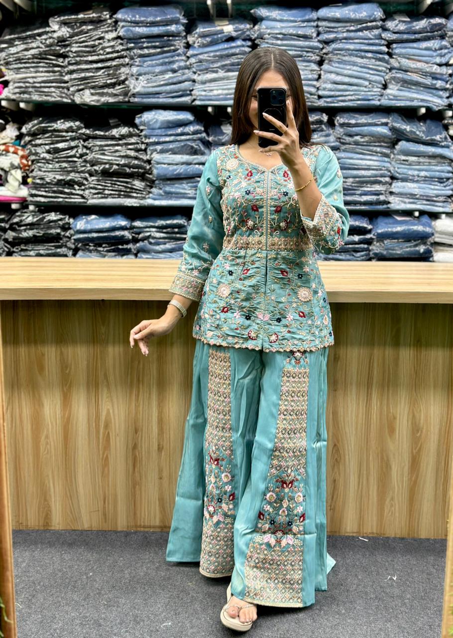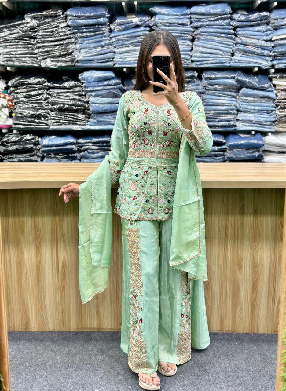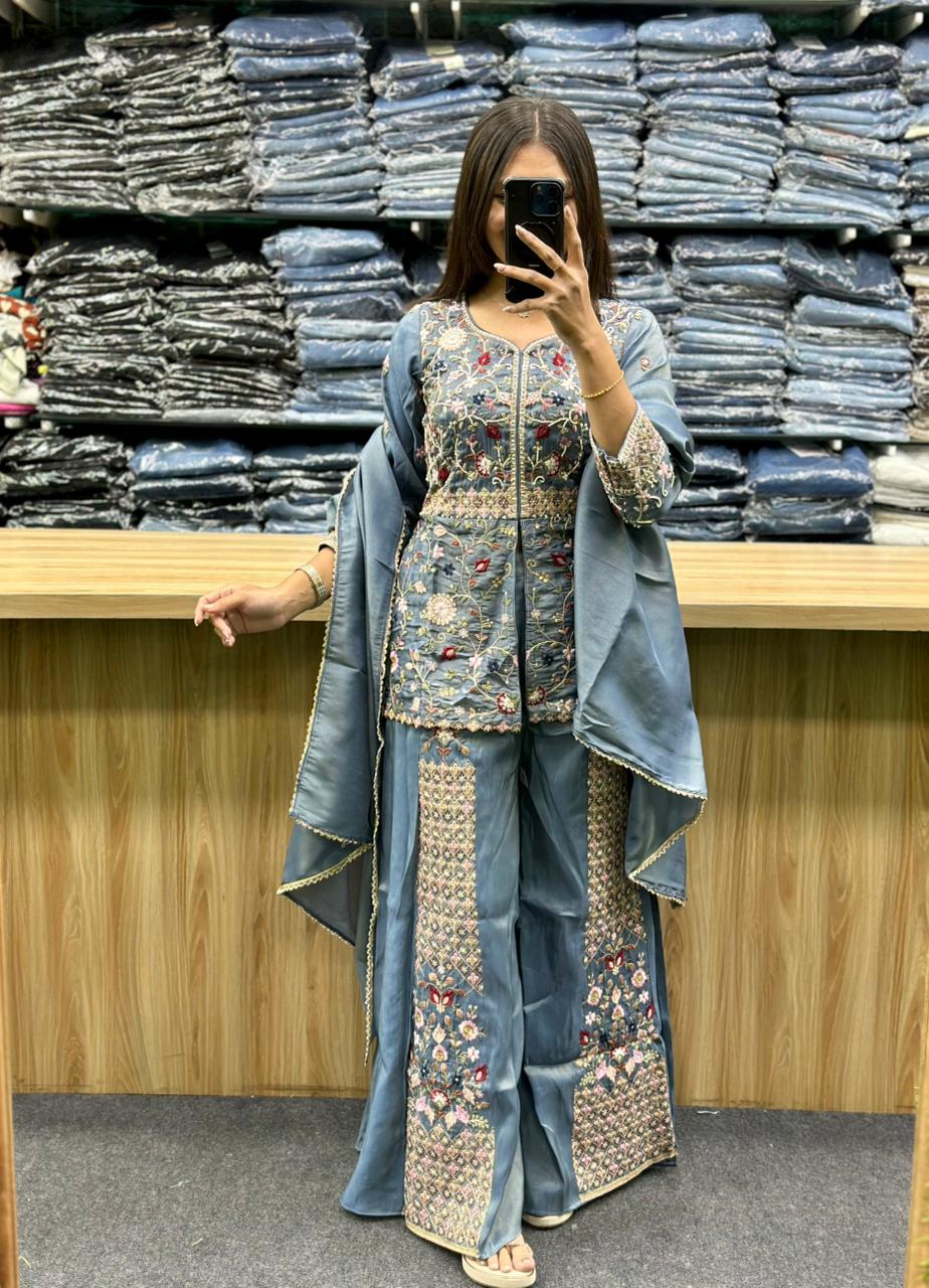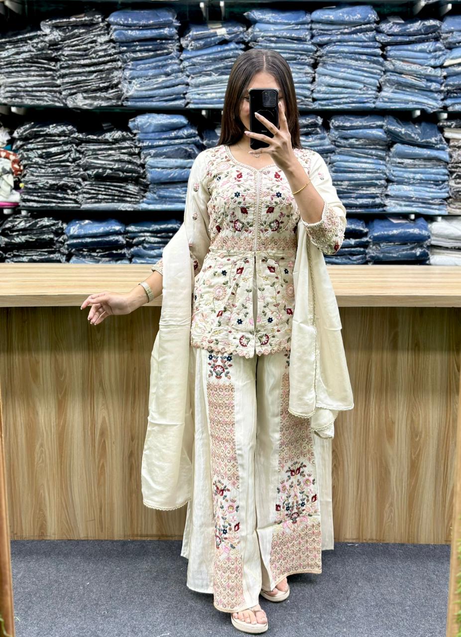 STYLE : PEPLUM TOP WITH EMBROIDERY WORK AND SOME THREAD WORK,WIDELEG PLAZA ALSO HAVE EMBROIDERY AND MULTY COLOR THREAD WORK,AND SIMPLE PLAIN DUPATTA
