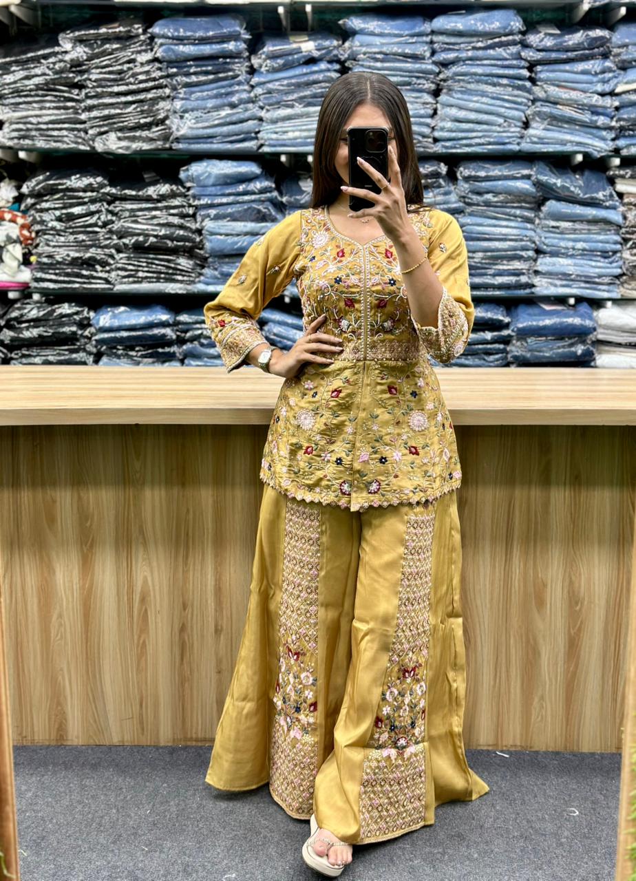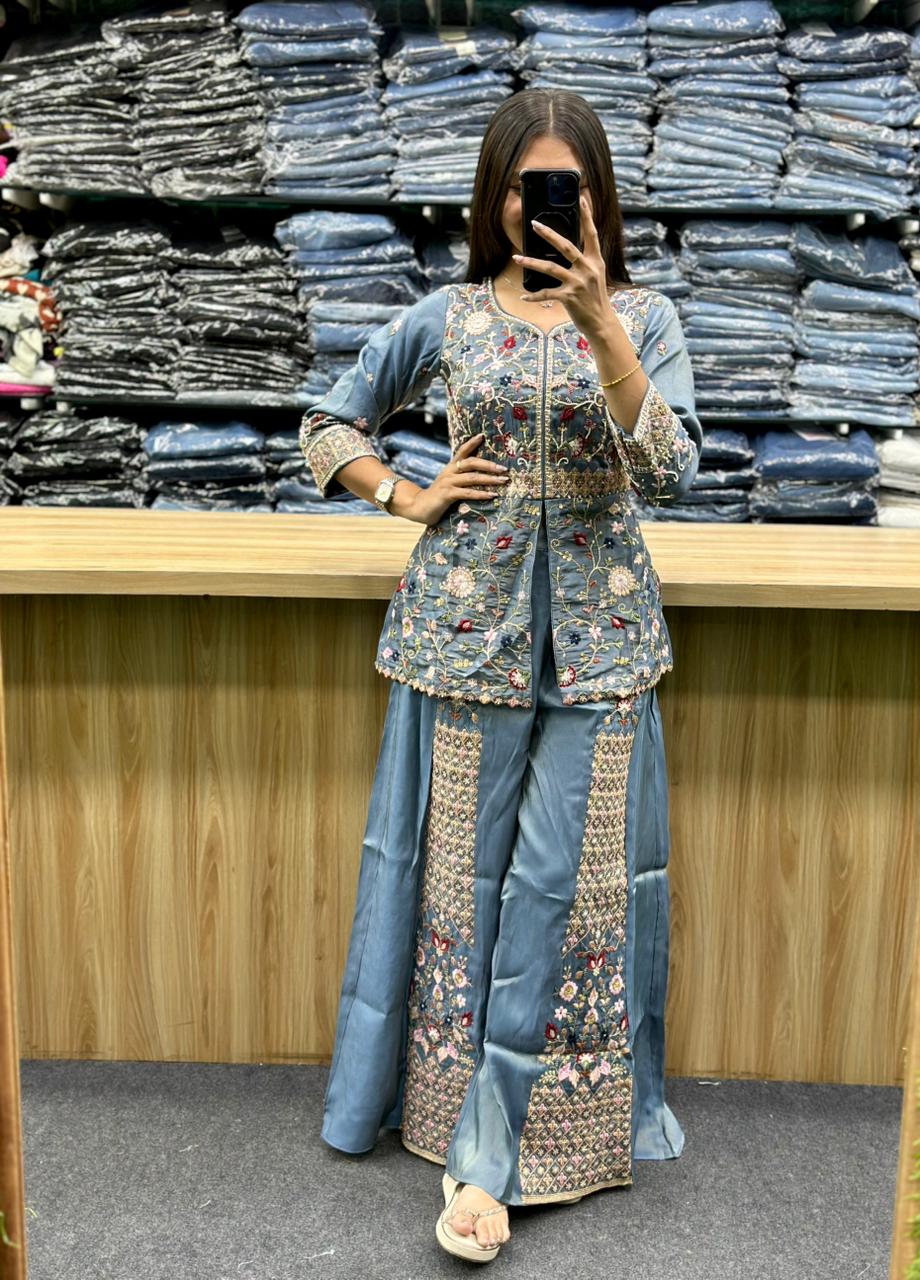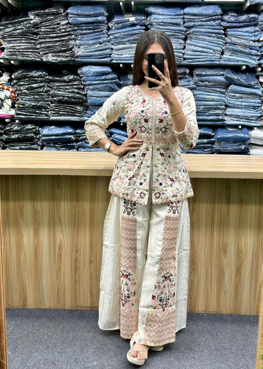 STYLE : PEPLUM TOP WITH EMBROIDERY WORK AND SOME THREAD WORK,WIDELEG PLAZA ALSO HAVE EMBROIDERY AND MULTY COLOR THREAD WORK,AND SIMPLE PLAIN DUPATTA