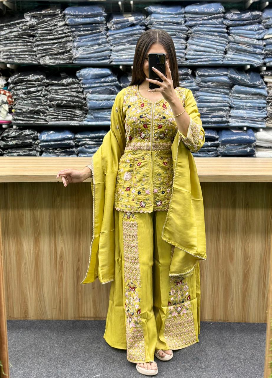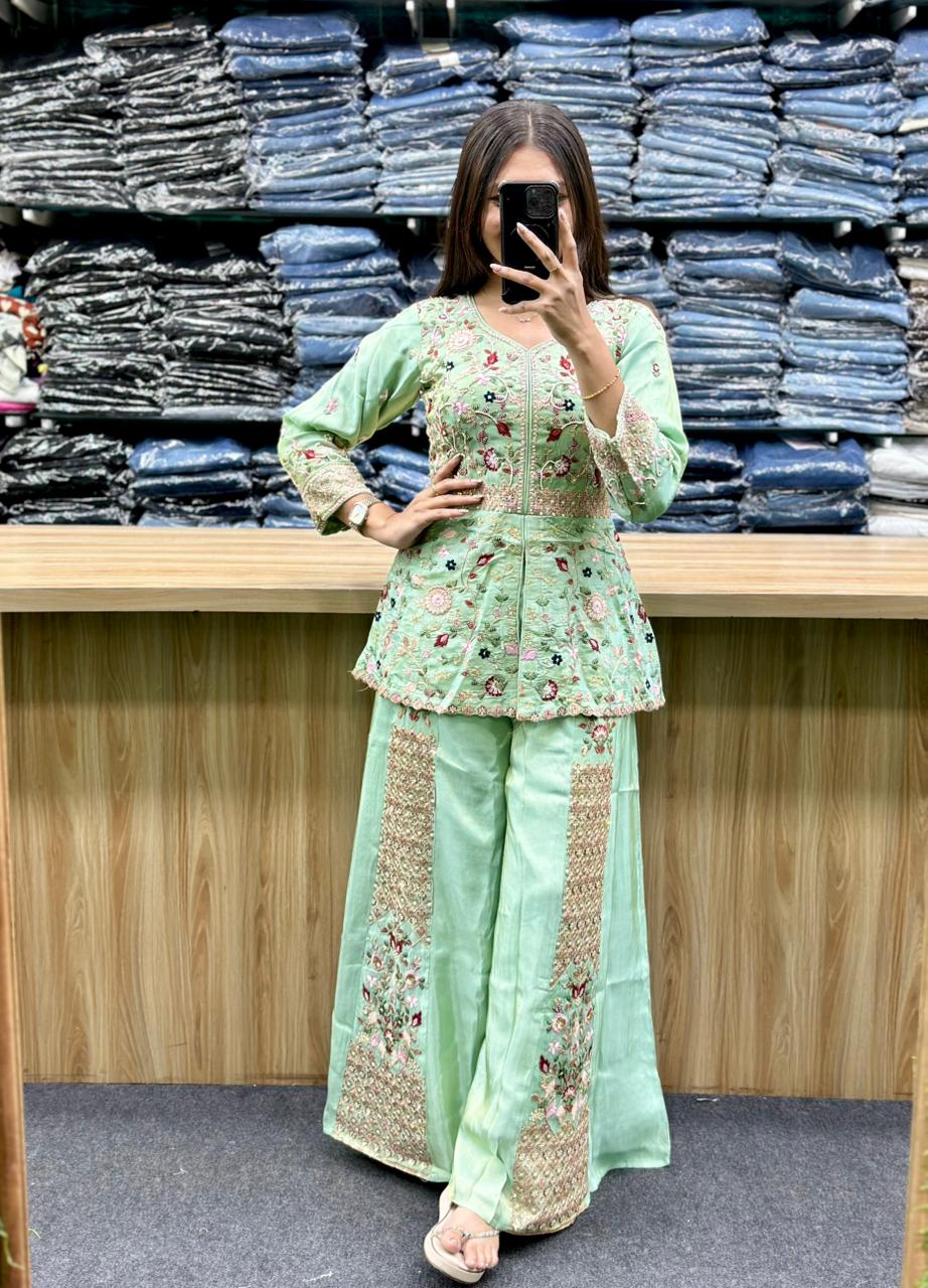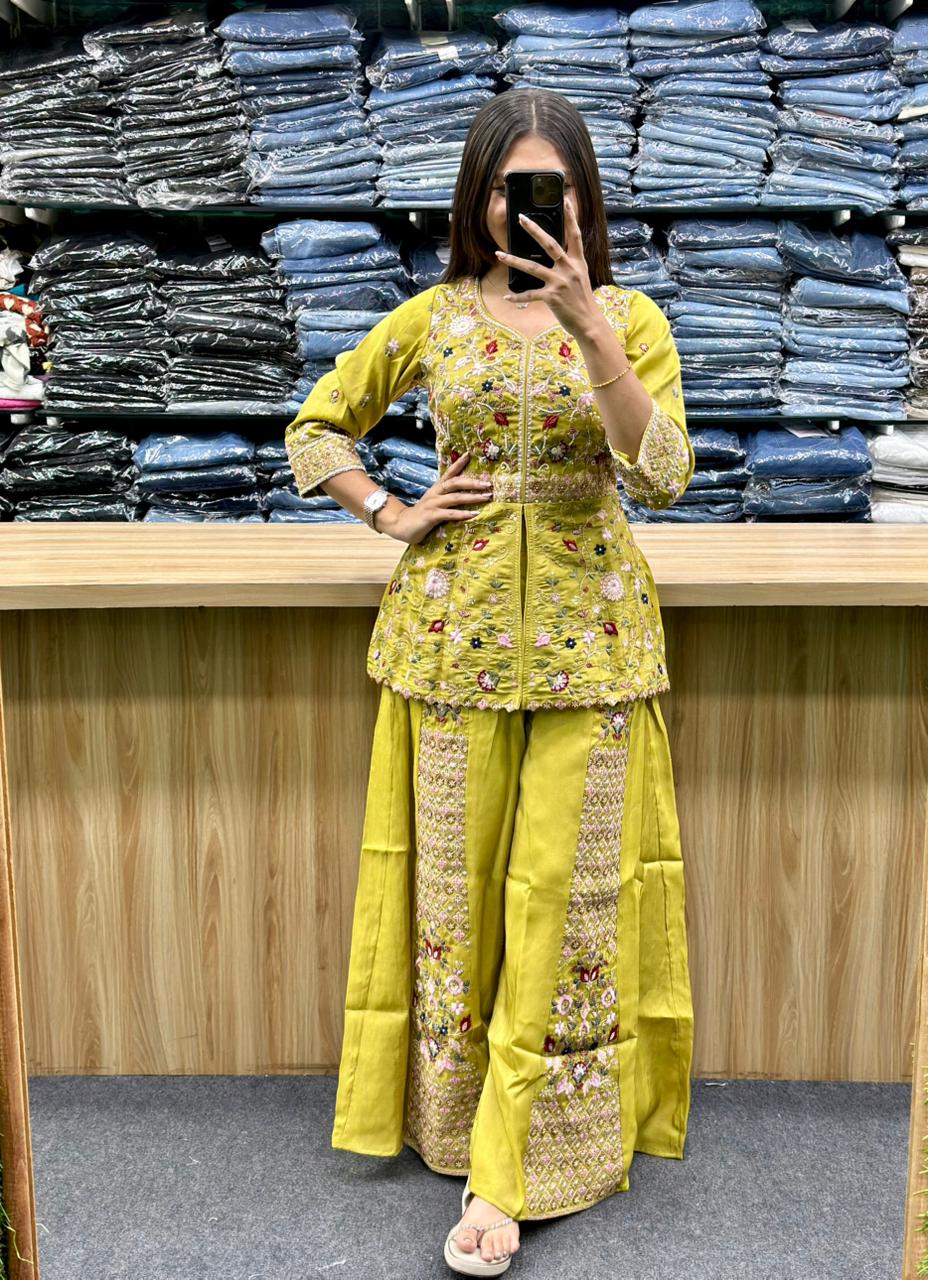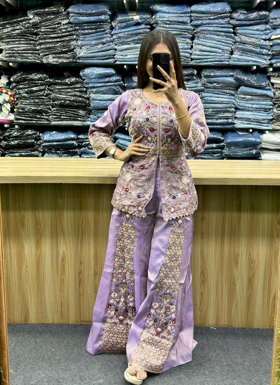 STYLE : PEPLUM TOP WITH EMBROIDERY WORK AND SOME THREAD WORK,WIDELEG PLAZA ALSO HAVE EMBROIDERY AND MULTY COLOR THREAD WORK,AND SIMPLE PLAIN DUPATTA