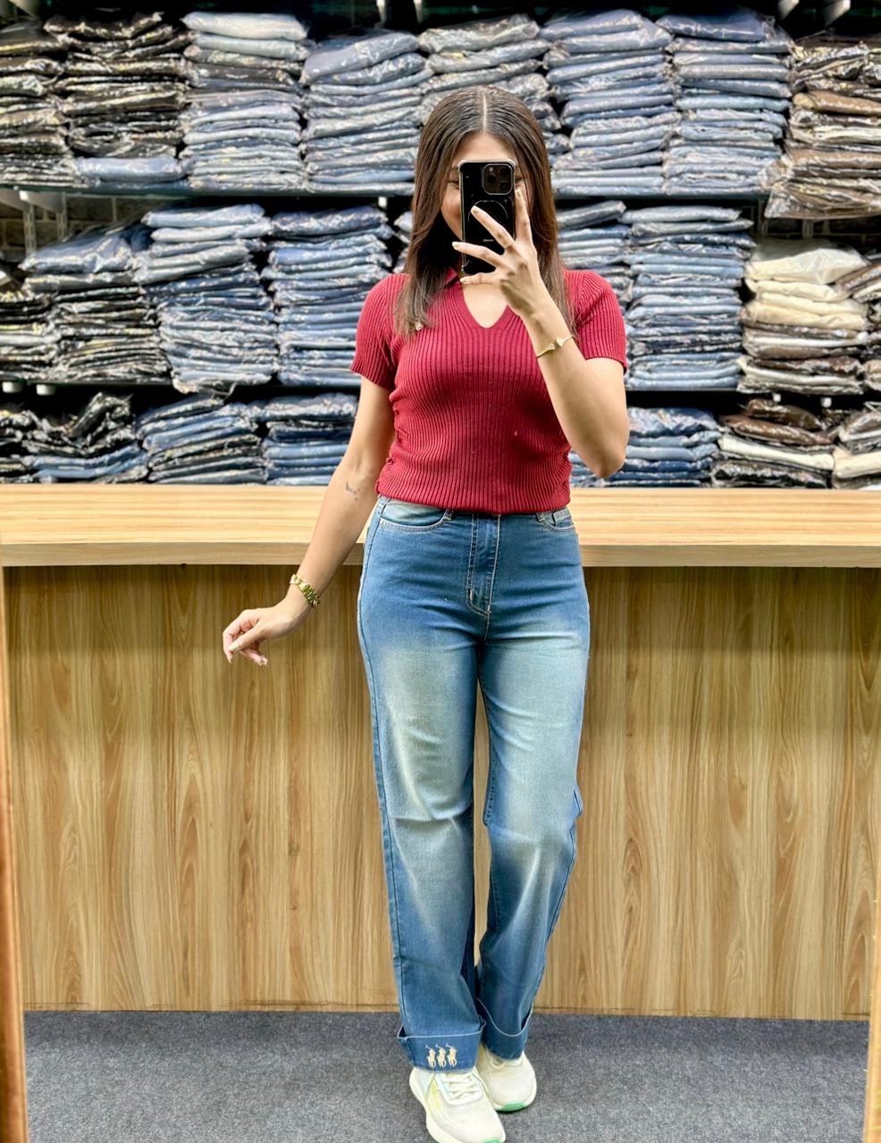 - Top: The top is a fitted, short-sleeve, ribbed knit shirt featuring a notch neck design. It is a solid, deep red or maroon color.