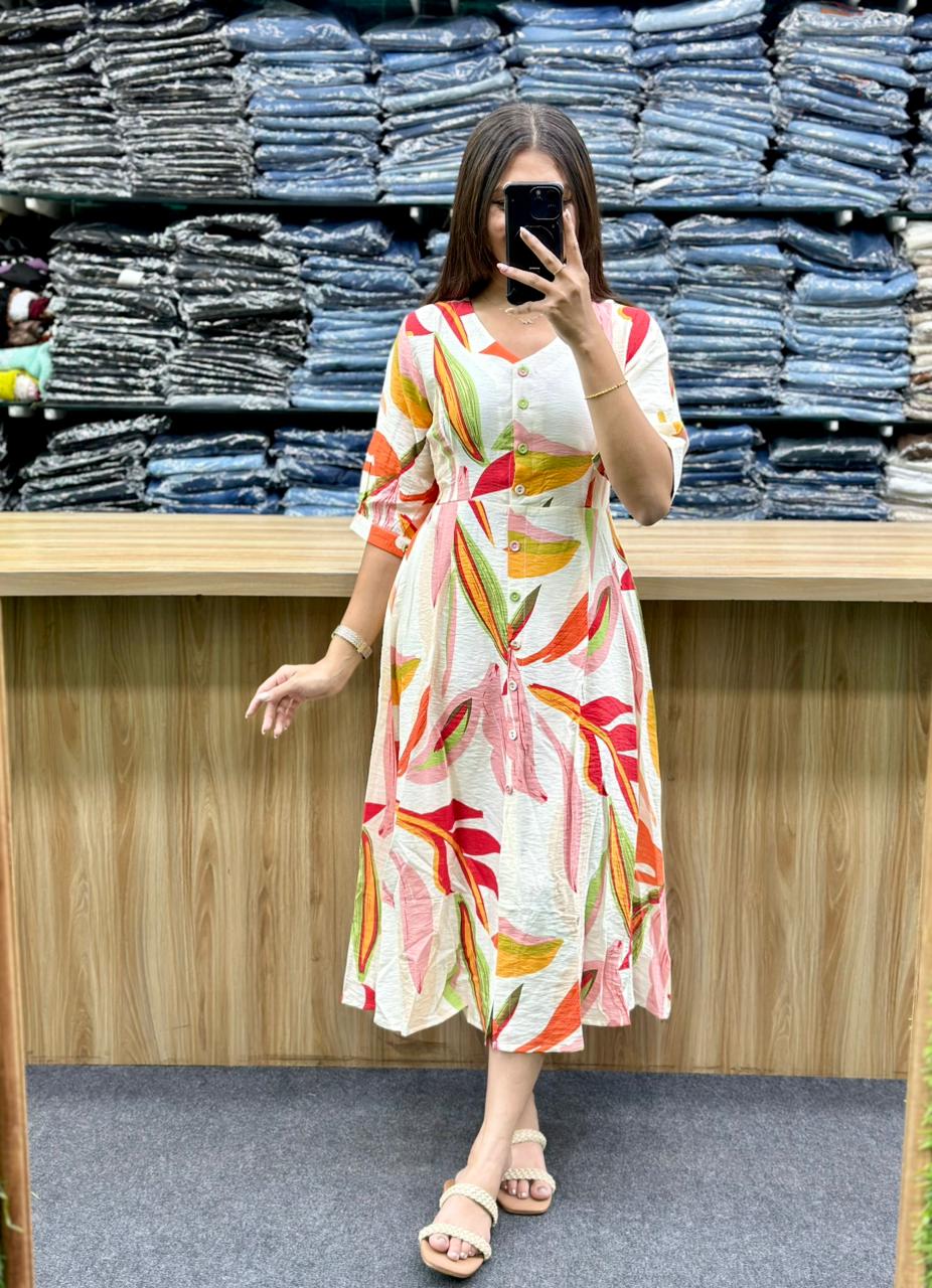 - Print: The dress showcases a prominent leaf pattern in various bright hues such as red, orange, pink, and green, giving it a lively and natural feel.