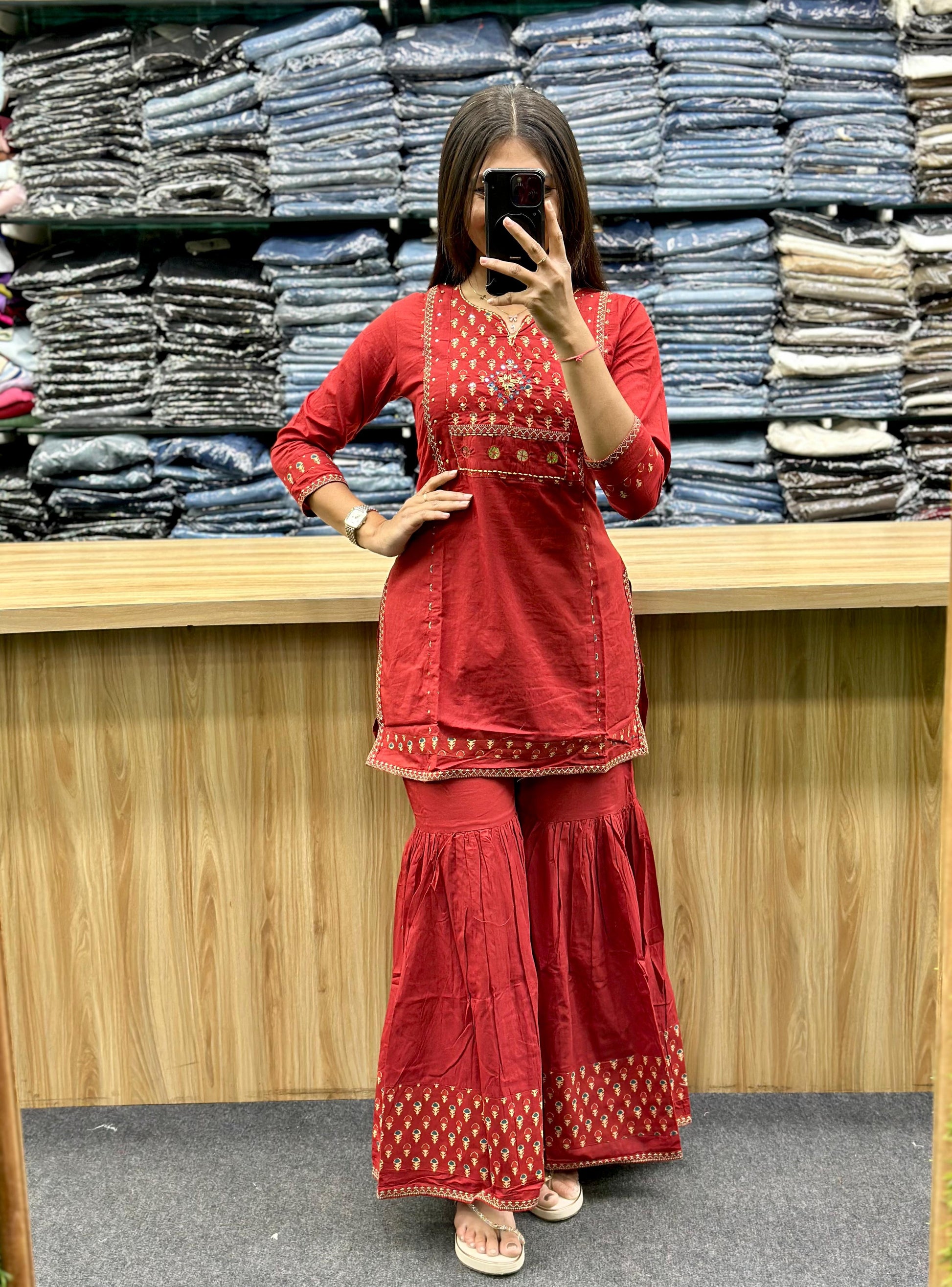 STYLE : SHORT TOP WITH THREAD WORK ON IT ,PRINTED SHARARA AND PRINTED MATCHING DUPATTA