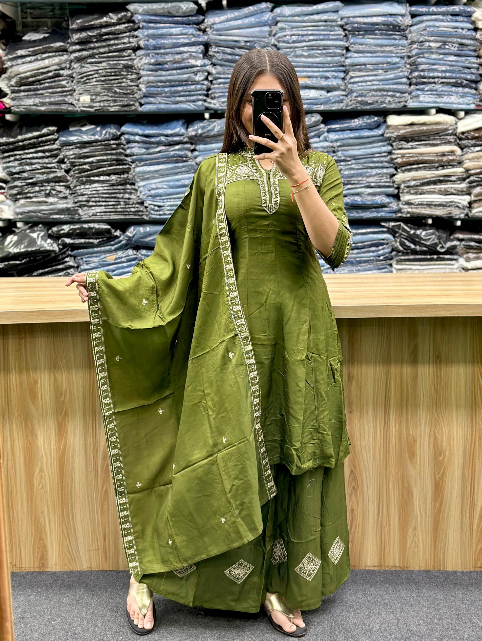 STYLE : SHORT KURTI WITH CHINESE COLLAR AND HAVE SOME EMBROIDERY WORK ON SHOULDER,FLARED PLAZA WITH SMALL PATCHES ON IT AND WORKED BORDER ON DUPATTA