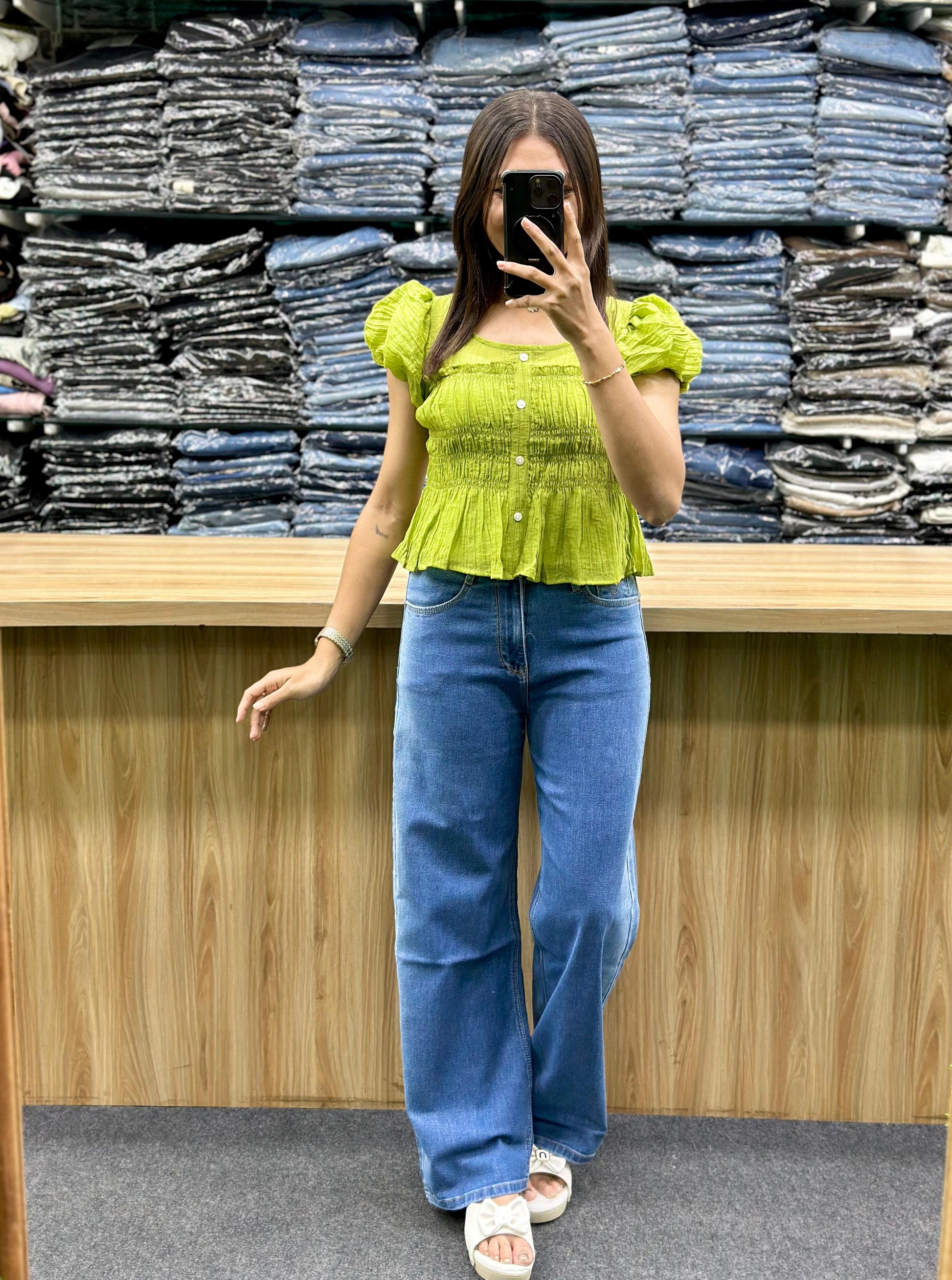 - Top: A short-sleeved top in an earthy orange or mustard hue. It has a smocked or gathered bodice for a fitted look and features voluminous puff sleeves, adding a touch of femininity and trendiness.