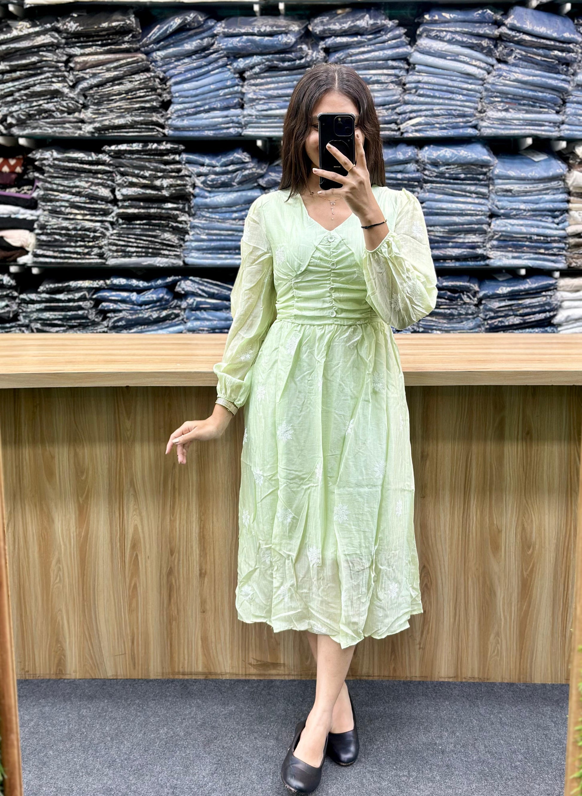 - Bodice & Waist: The bodice includes a ruched or gathered detail at the front, adding texture and shaping, and appears to have a defined waistline for a cinched look.