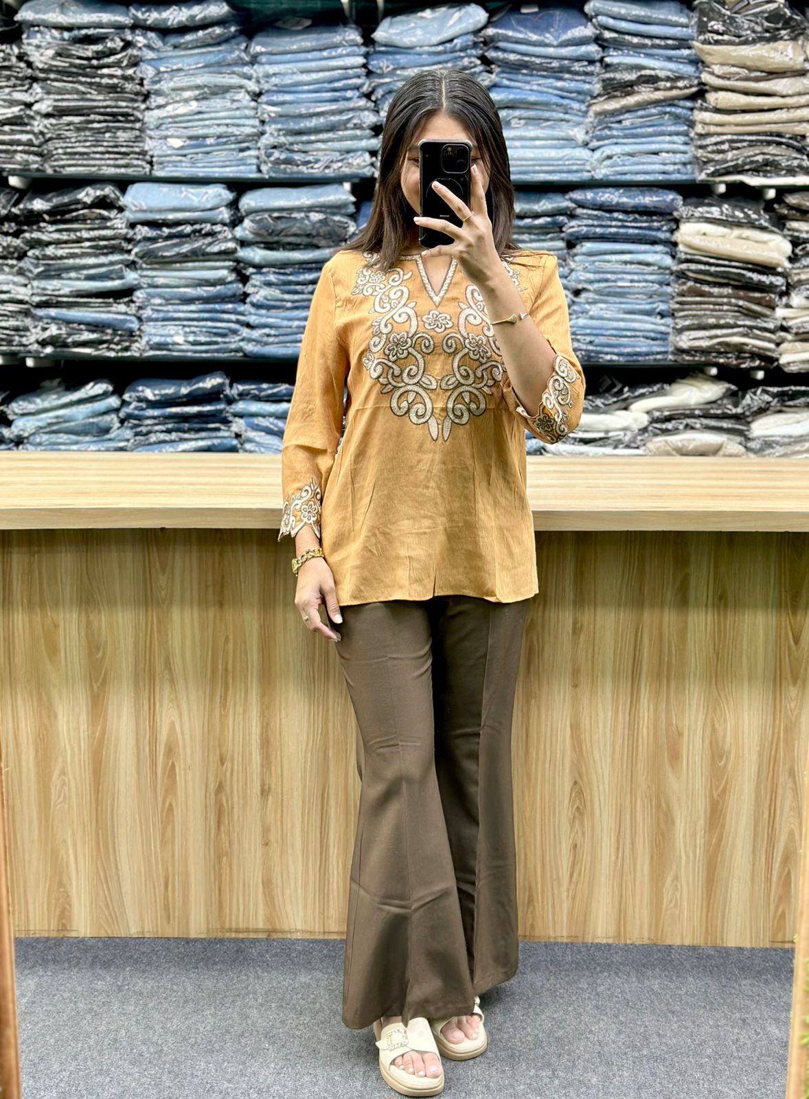 tunic top with white, intricate embroidery around the V-neckline and on the sleeves.
