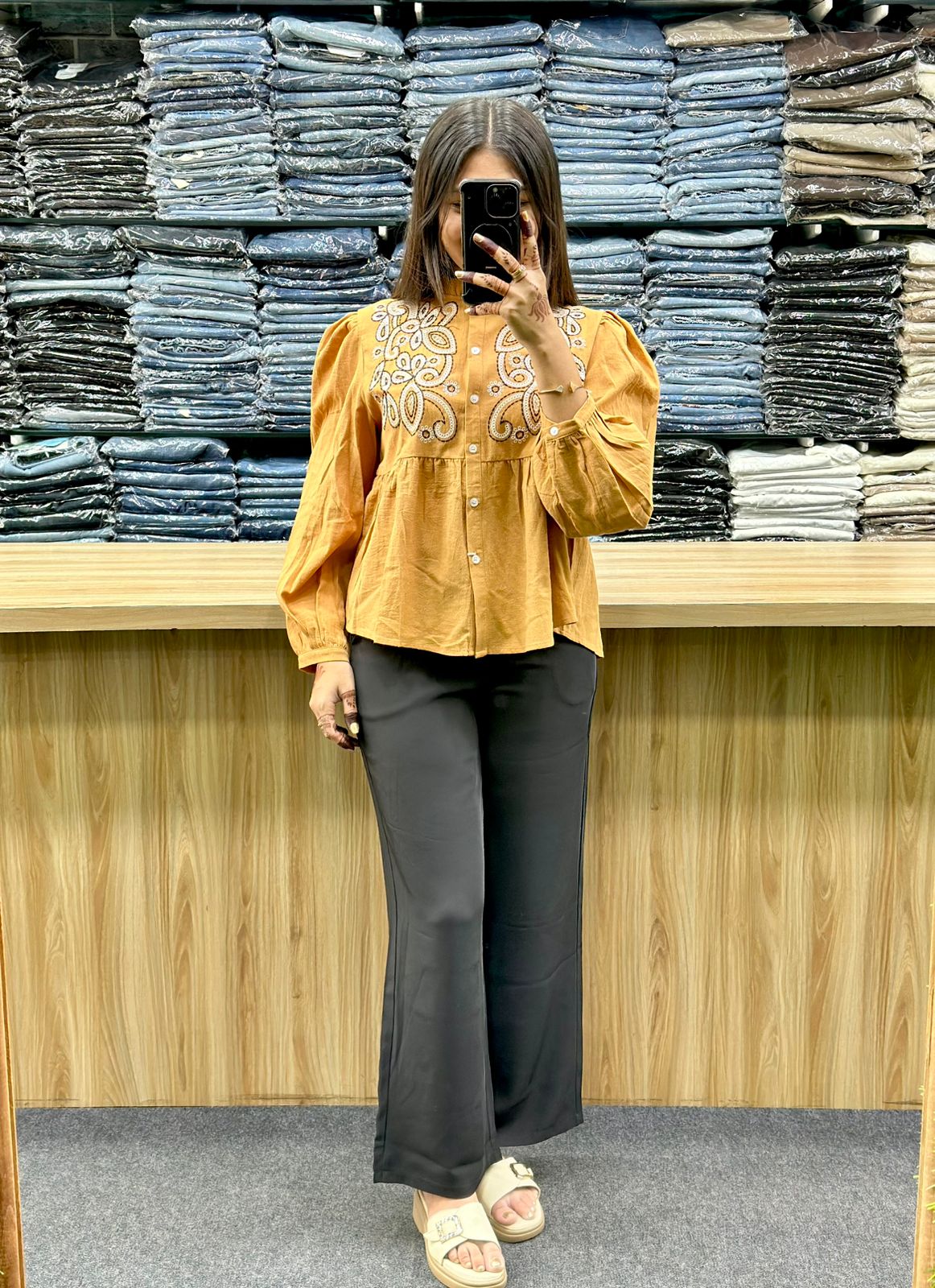 TOP :- button-down top featuring intricate white embroidery on the upper front panel. It has long puff sleeves with gathered cuffs and a mandarin-style round collar. Similar styles are often described as embroidered tunics or cotton satin casual shirts.