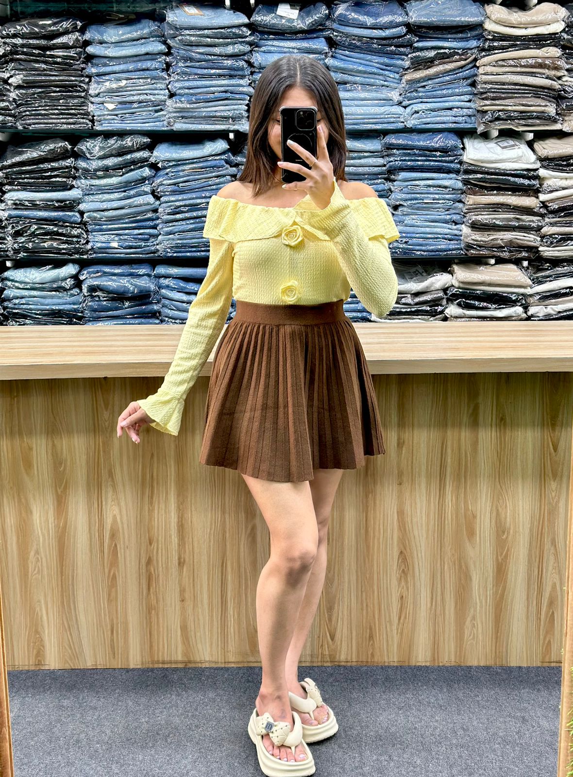 The outfit consists off-the-shoulder long-sleeve crop top a knit or smocked material and is cropped.