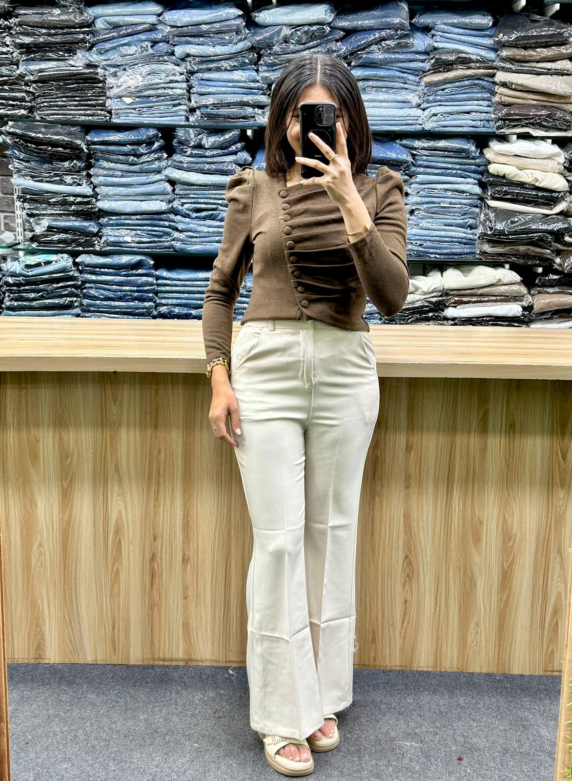 Top: The woman is wearing a fitted, long-sleeve top. It features distinctive puff sleeves and a square neckline, adding a touch of drama and femininity. which gives the top a unique, elegant texture.