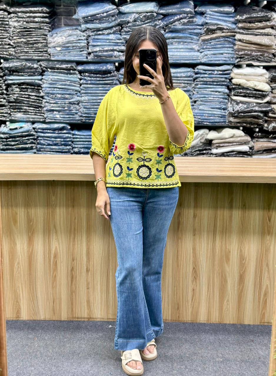Top: a round neckline and short, possibly flared or puff sleeves. It is detailed with colorful floral or geometric embroidery around the neckline, sleeves.