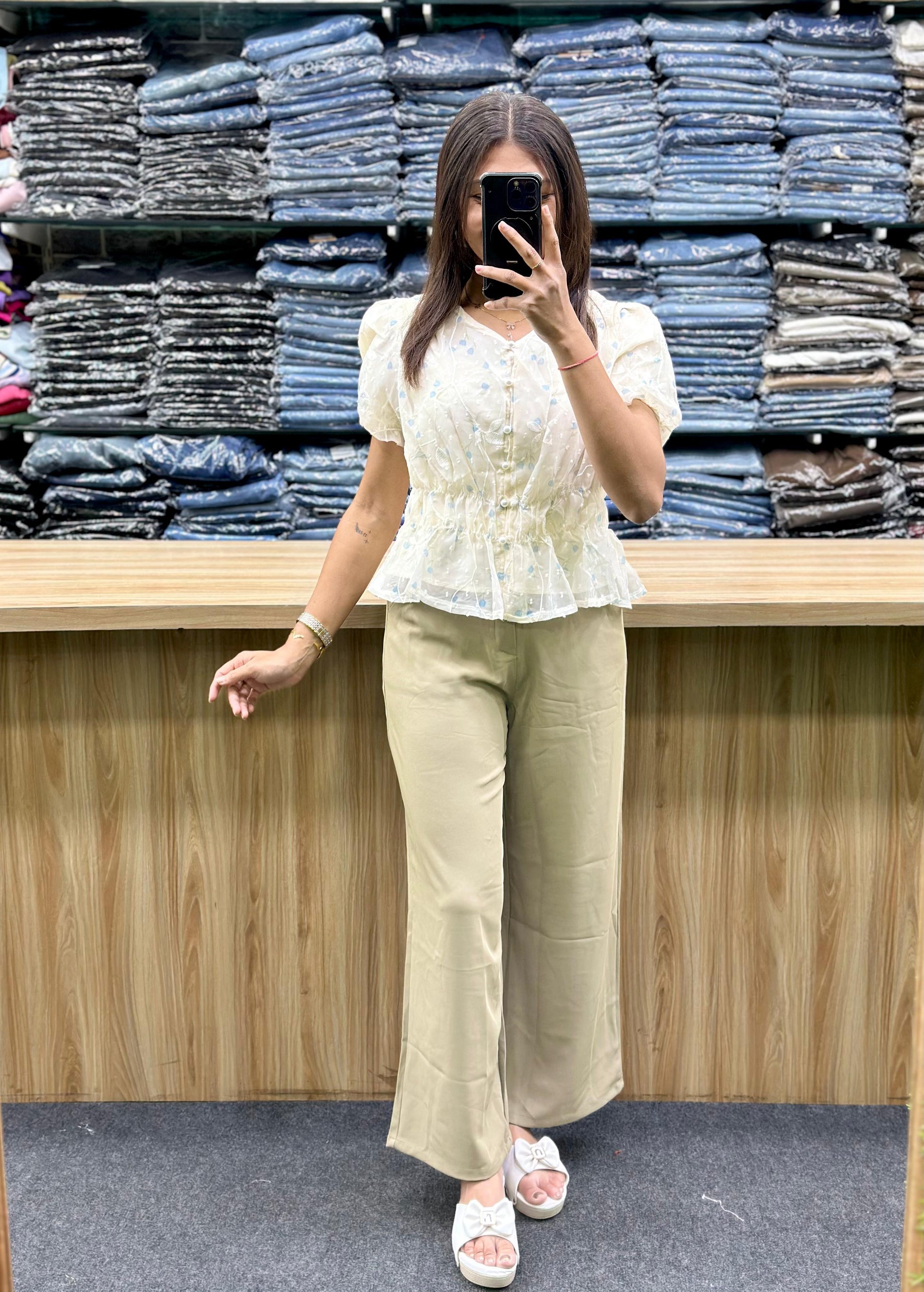 - Top: She is wearing a light-colored (likely cream or off-white) peplum top with short puff sleeves. The top has a V-neckline and features a gathered or ruffled waistline that creates the distinctive peplum silhouette, flattering the figure by accentuating the waist. The fabric appears to be lightweight and possibly textured or slightly sheer.