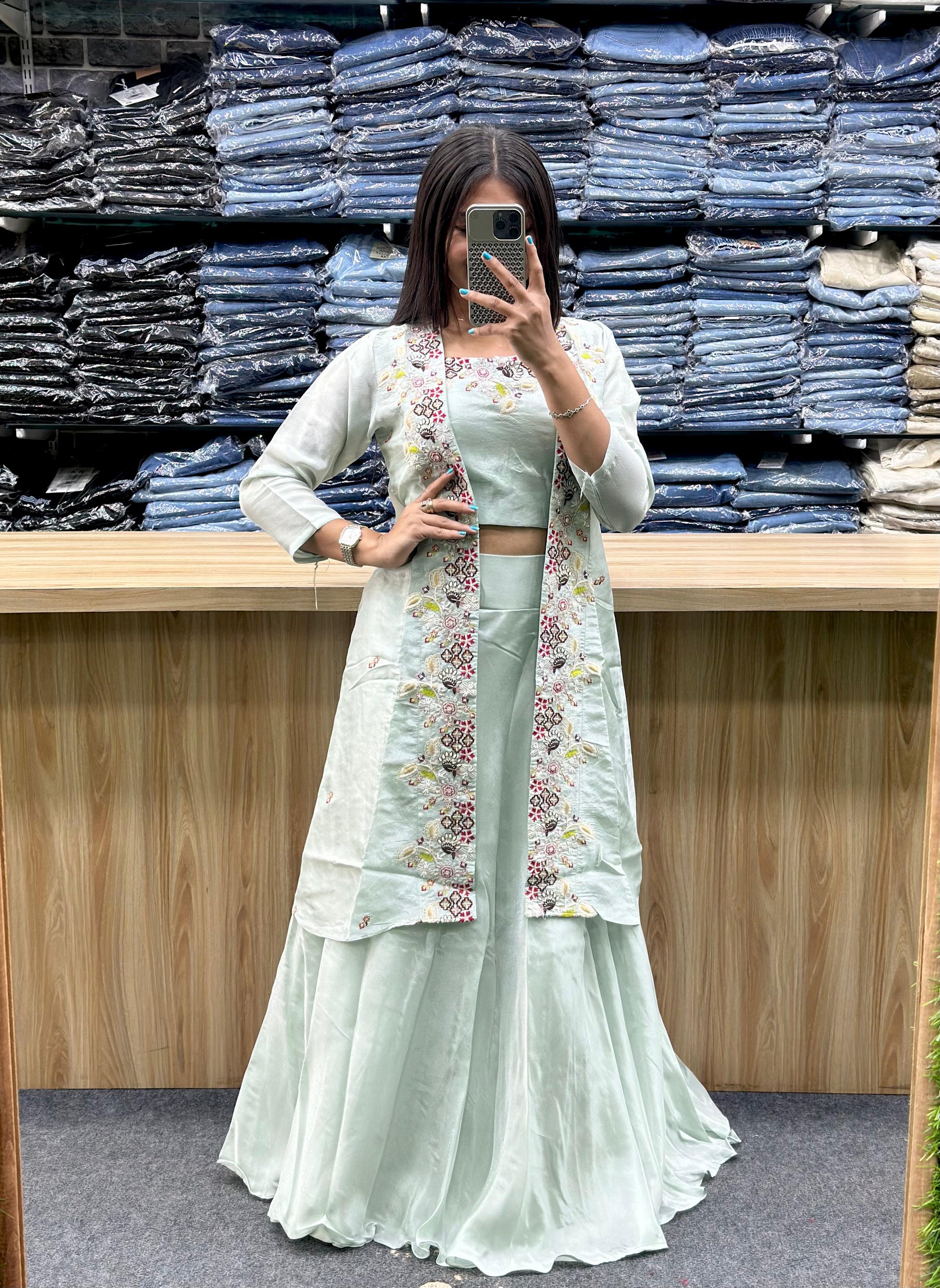 - Overall Style: The combination creates a chic and elegant look, blending traditional Indian embroidery with a contemporary silhouette, making it suitable for festive occasions or semi-formal events.