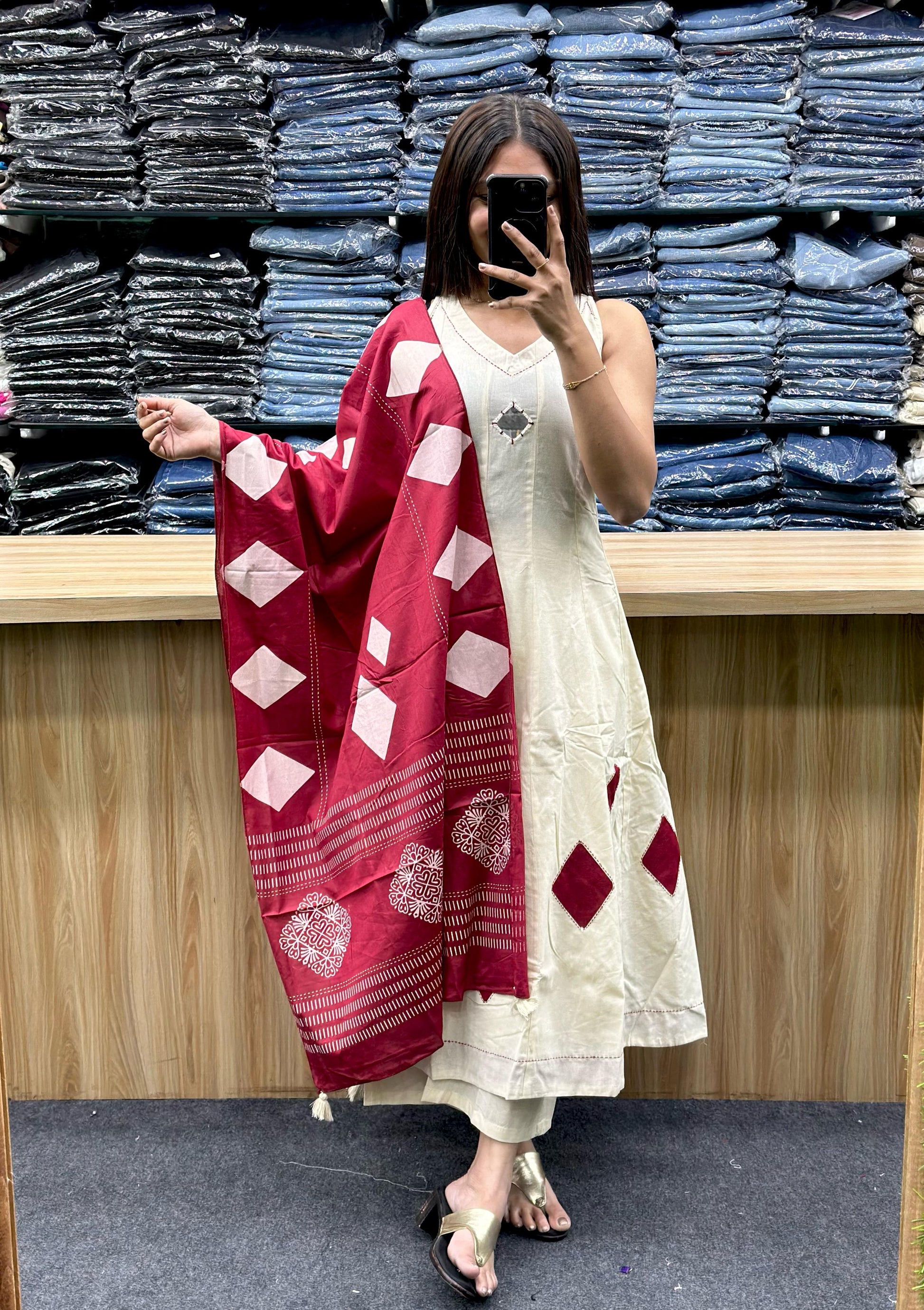 - Kurta: The white top is a long, sleeveless tunic with a V-neckline and a fitted bodice that flows into a flared or A-line silhouette, characteristic of an Anarkali style. It features subtle decorative elements, including what appears to be embroidery or appliqué work around the neckline and a few maroon diamond-shaped patches on the lower flared part of the kurta.