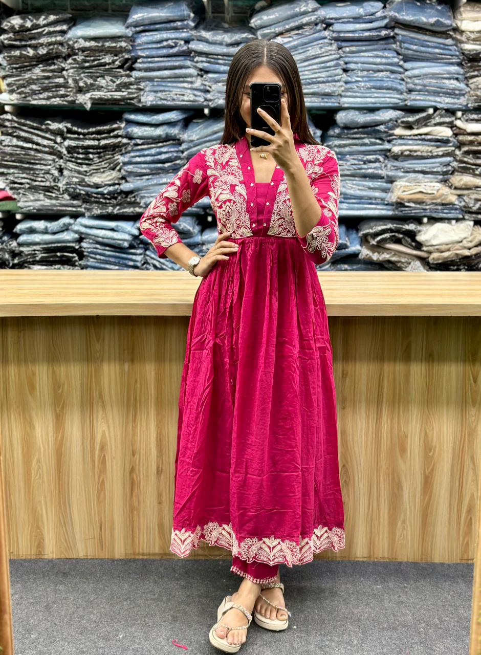 - Pants: The kurta is paired with matching pants, likely a churidar or a straight-cut style, which are visible at the ankles and feature a border with similar embroidery.