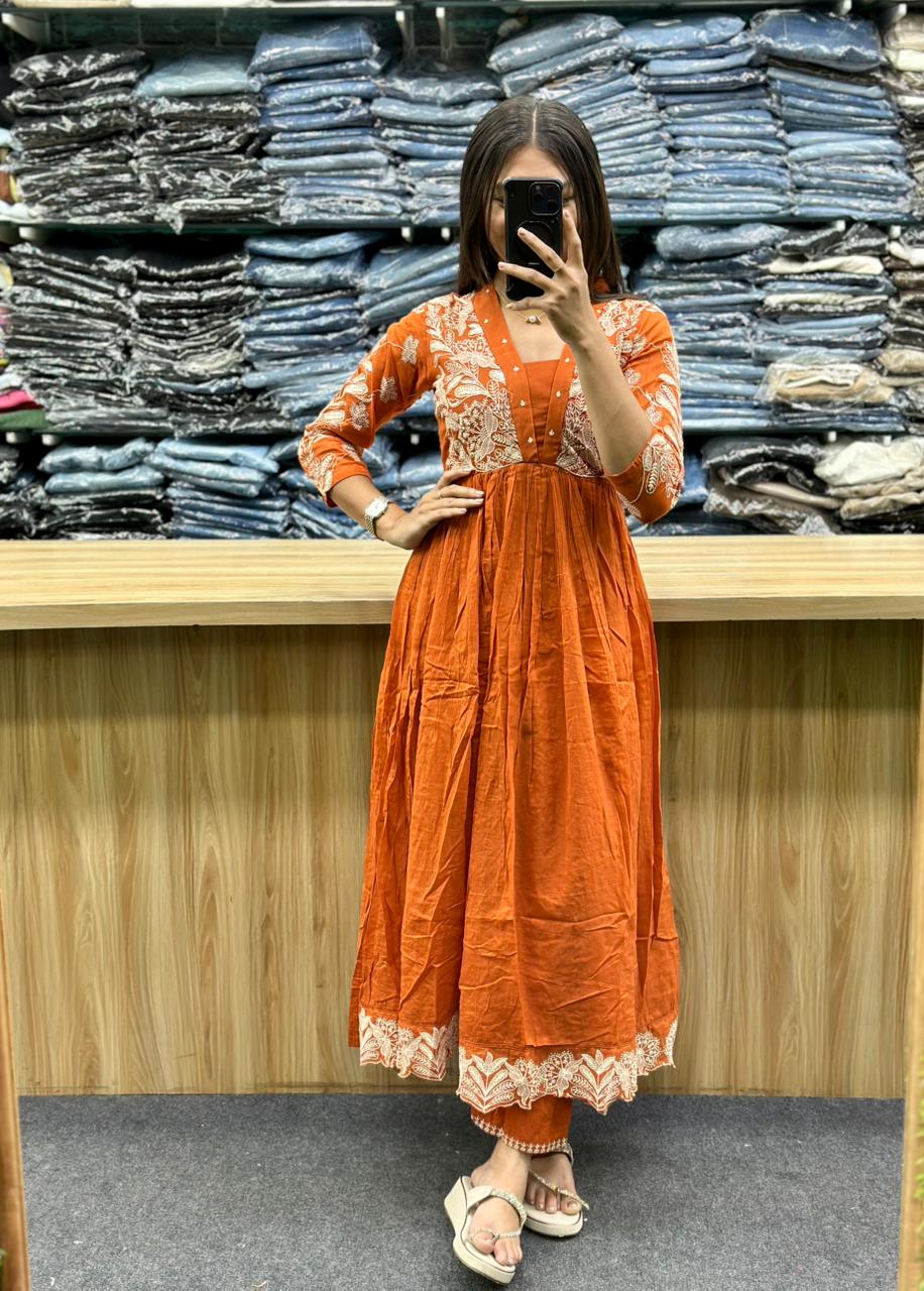 - Kurta: The long, flowing Anarkali-style kurta is a shade of deep pink and orange. It has a fitted bodice that flares out from the waist with multiple pleats, giving it a regal and voluminous silhouette. The yoke and sleeves are adorned with intricate golden embroidery.