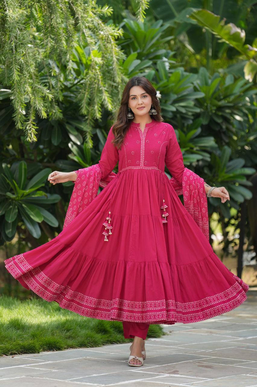 - Kurti Style: It's an Anarkali-style kurti, characterized by its flared silhouette that starts fitted at the bodice and gradually widens towards the hem.