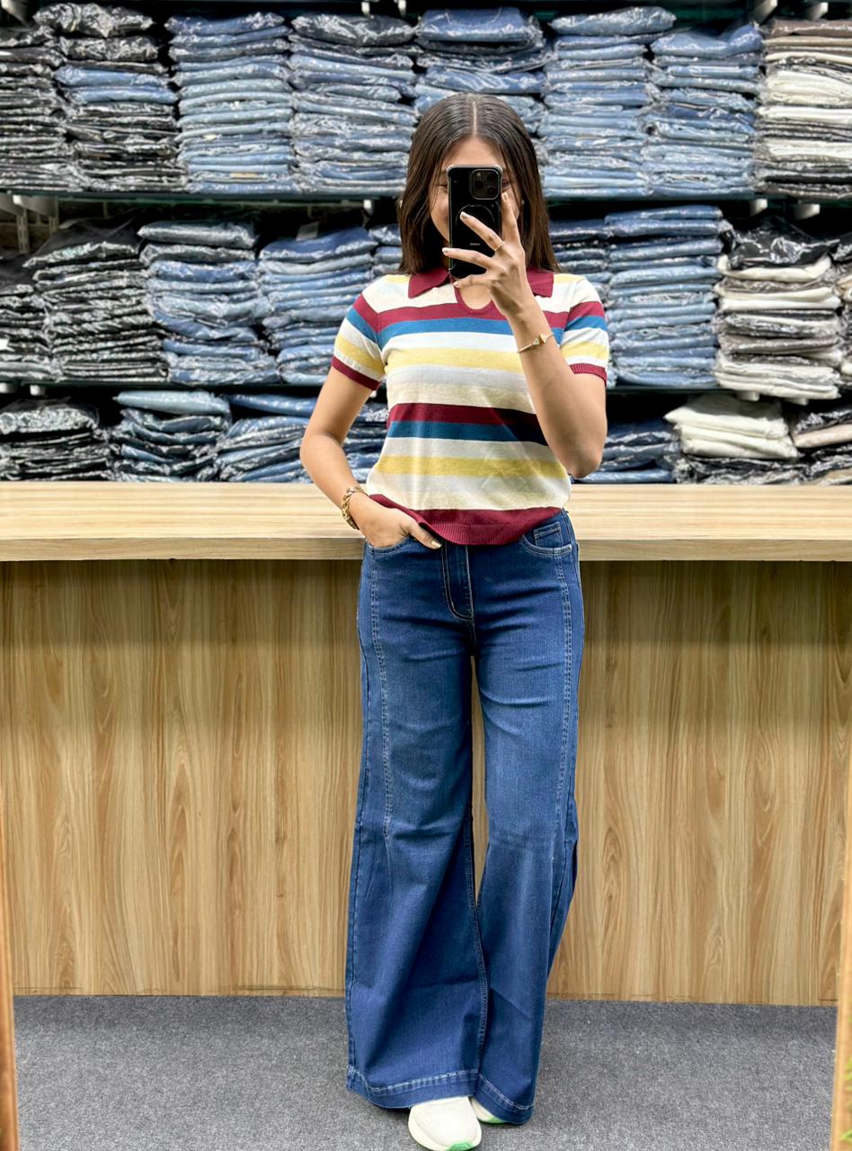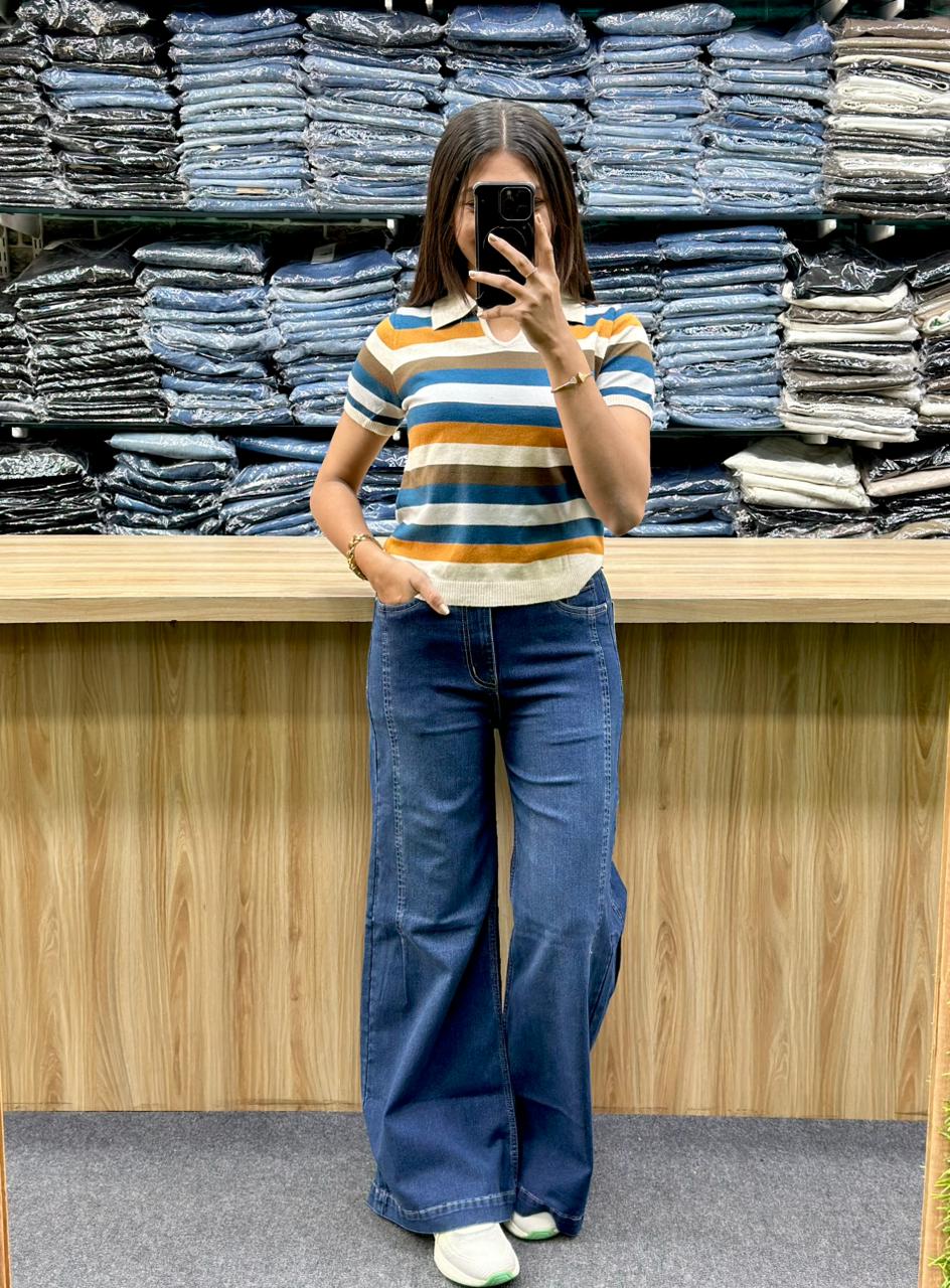 The outfit is a casual and trendy ensemble featuring a multi-colored striped top