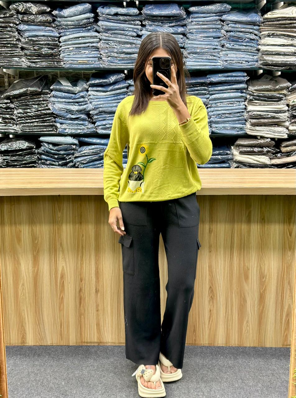 - Top: A long-sleeved, round-neck sweater or pullover in a vibrant lime green or yellow-green hue. It features some subtle self-design or embroidery details on the front.