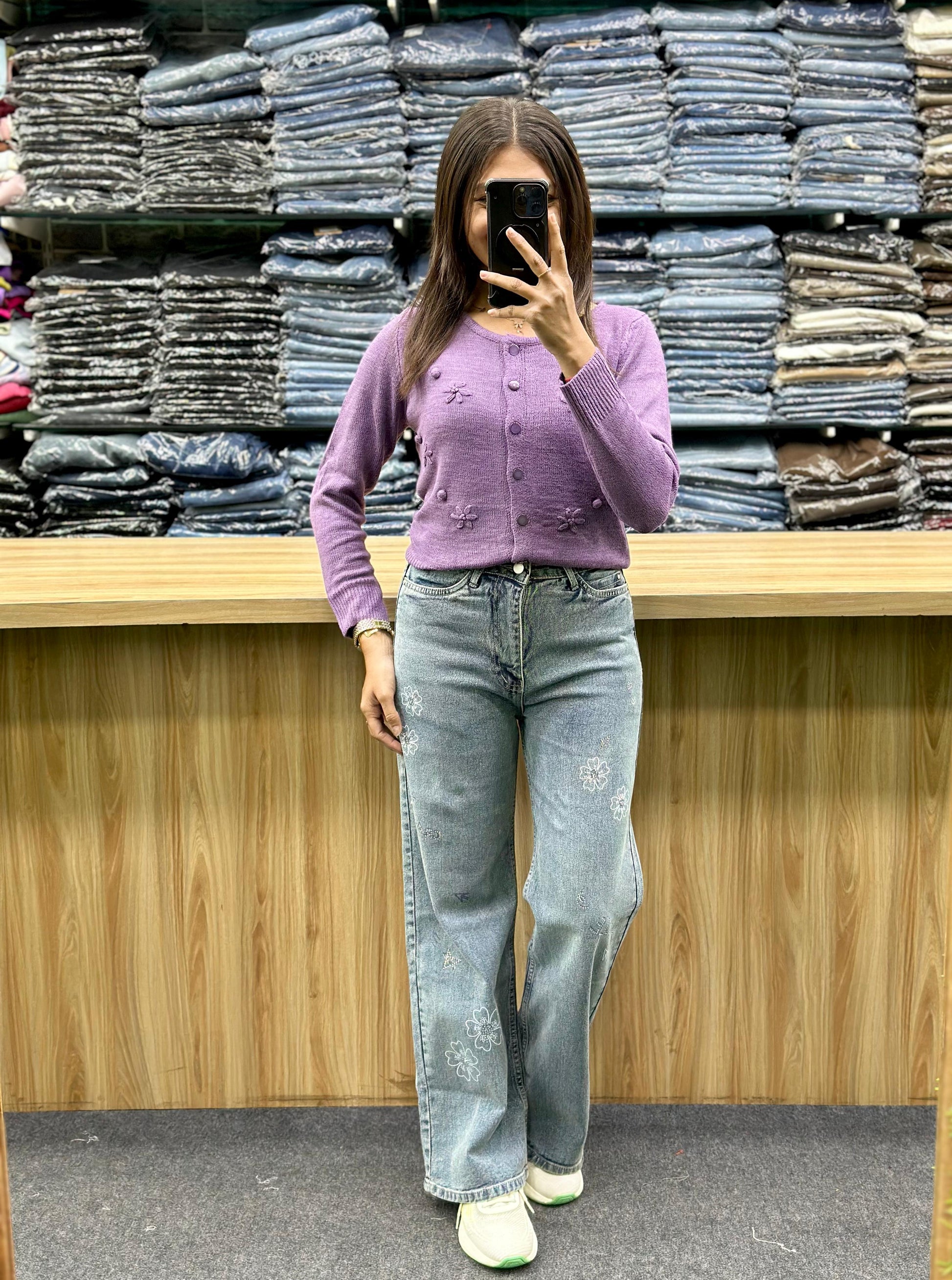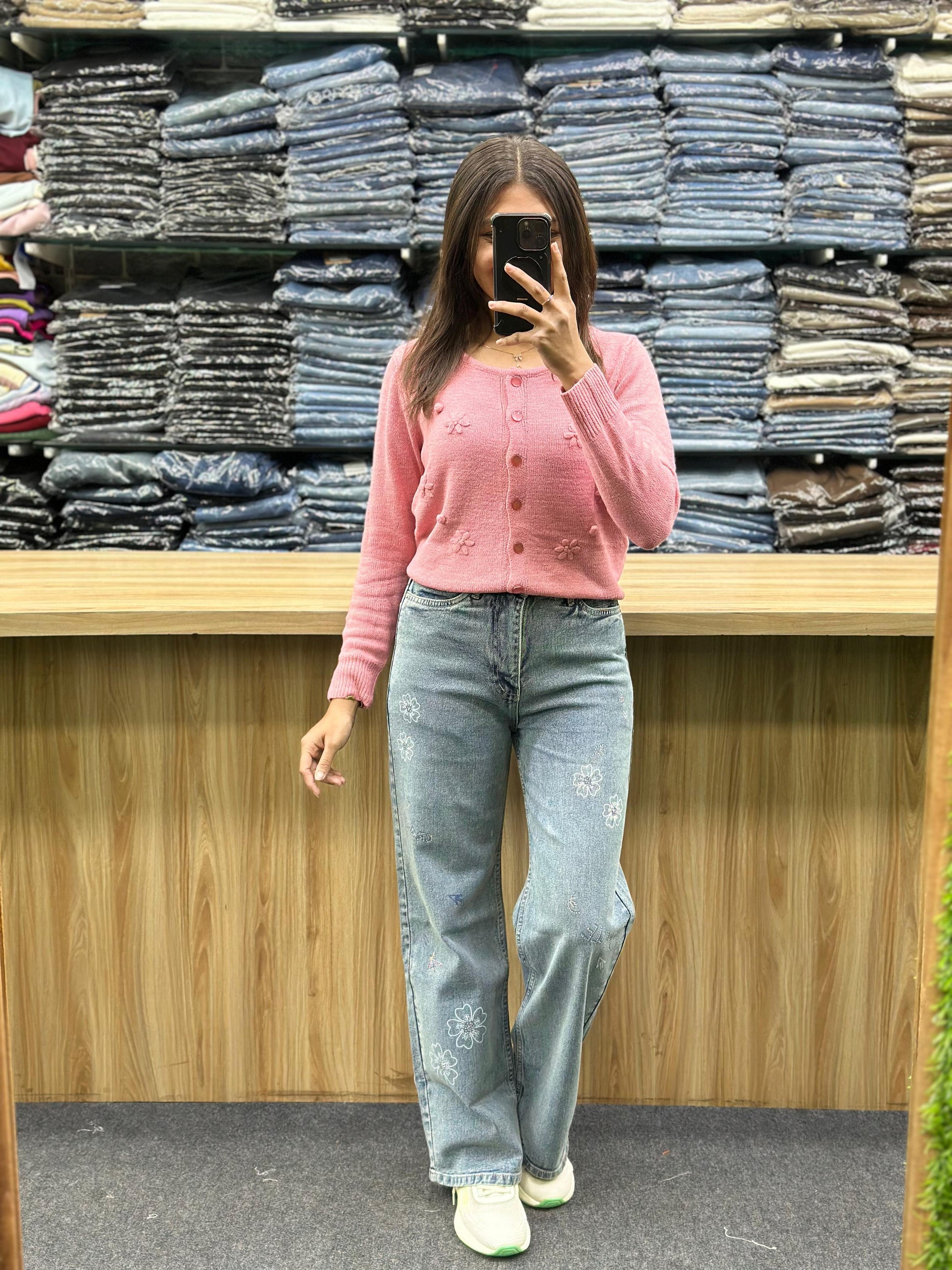 - Bottom: Paired with the cardigan are light blue, high-waisted, wide-leg jeans. The jeans feature white floral embroidery on the thighs and lower legs, adding a decorative element to the denim.